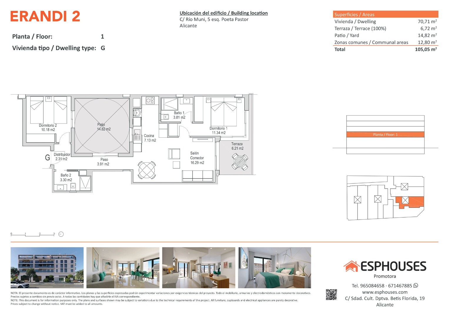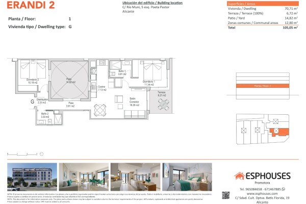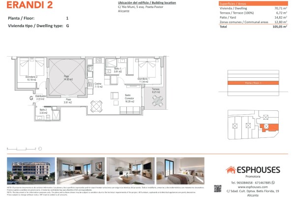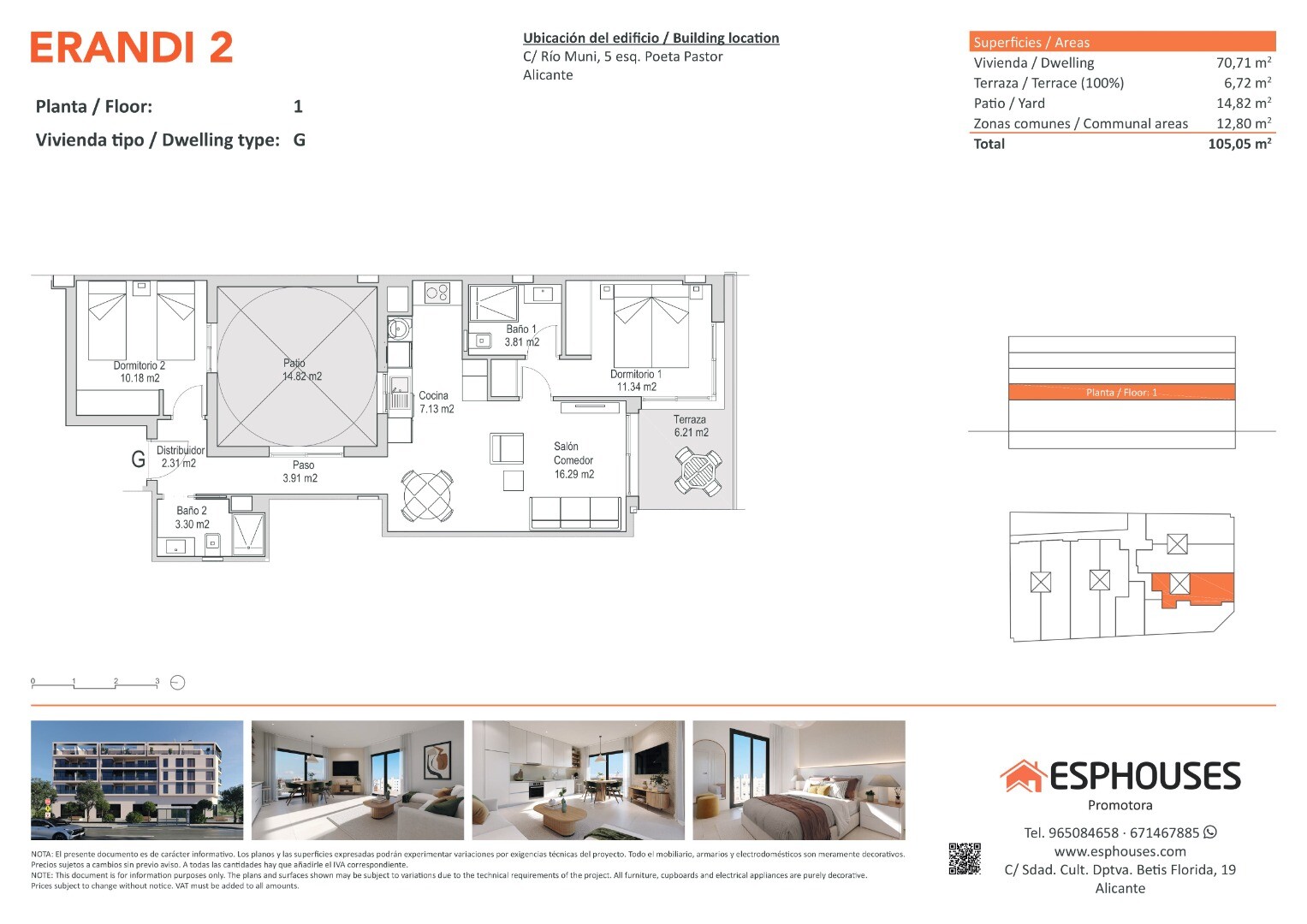 Dit nieuwbouwappartement bevindt zich op de eerste verdieping van het gebouw ERANDI 2 en heeft een bebouwde oppervlakte van 70,71 m². De woning beschikt over twee slaapkamers met inbouwkasten, twee complete badkamers, een woon-eetkamer met open keuken, een zuidgerichte terras van 6,72 m² en een ruime privépatio van 14,82 m² — perfect om het hele ja...ar door buiten te genieten.