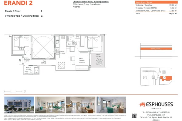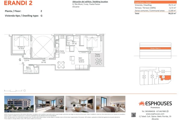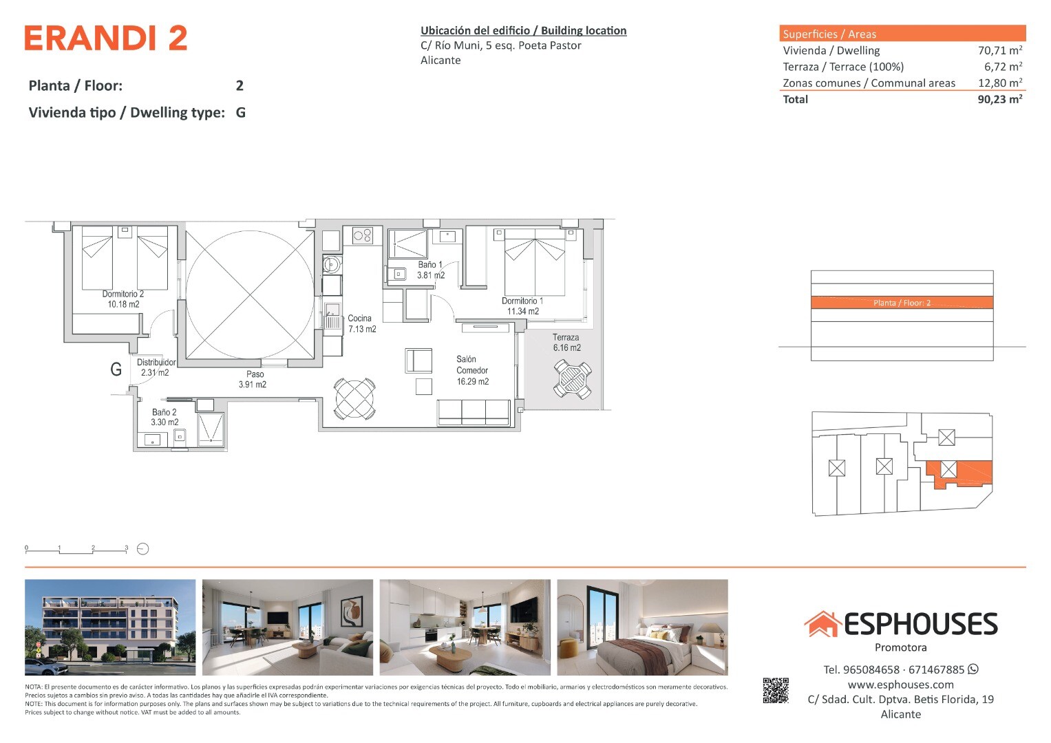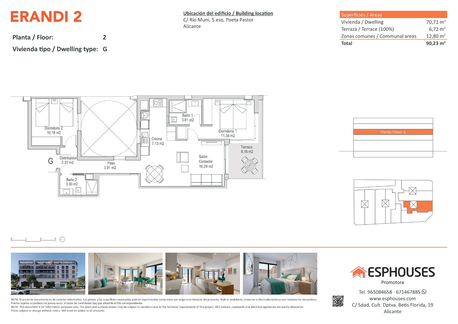 Dit moderne nieuwbouwappartement bevindt zich op de tweede verdieping van het gebouw ERANDI 2 – een stijlvolle ontwikkeling met gemeenschappelijk zwembad op het dak, gelegen in de bekende wijk La Florida, een van de best verbonden en snelgroeiende gebieden van Alicante. De woning heeft een bebouwde oppervlakte van 70,71 m² en beschikt over twee sla...apkamers met inbouwkasten, twee badkamers, een woon-eetkamer met open keuken en een zonnig terras van 6,72 m² op het zuiden, ideaal om de hele dag van de zon te genieten.