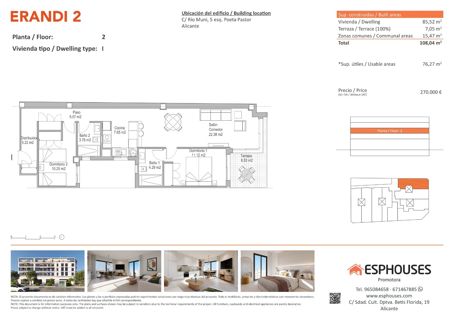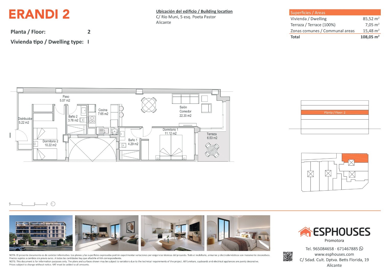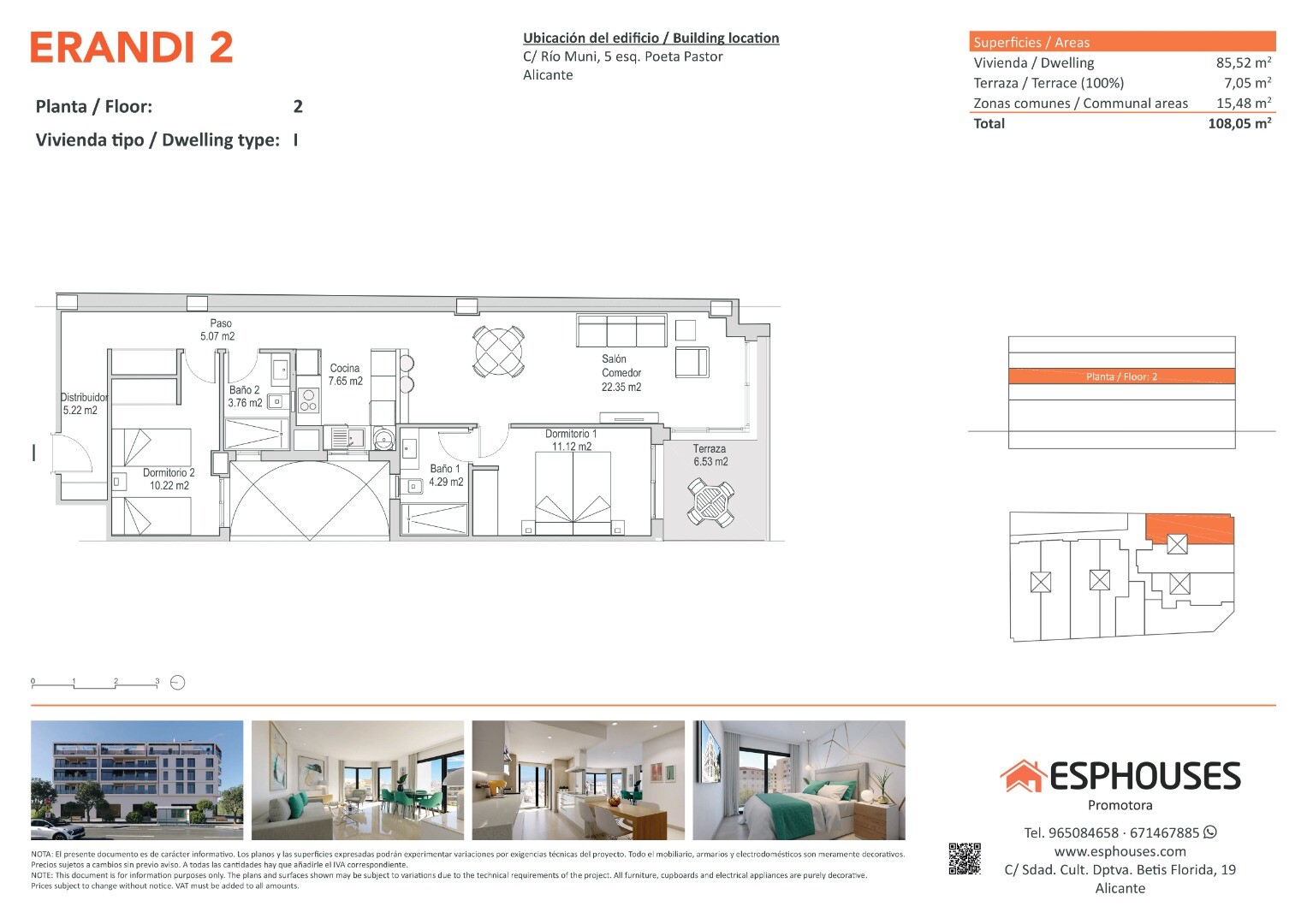 Deze aantrekkelijke nieuwbouwwoning bevindt zich op de tweede verdieping van het moderne gebouw ERANDI 2, gelegen in de gevestigde en goed verbonden wijk La Florida in Alicante. Met een bebouwde oppervlakte van 85,52 m² beschikt de woning over twee slaapkamers met inbouwkasten, twee badkamers, een ruime woon-eetkamer met open keuken en een zuidelij...k gelegen terras van 7,05 m², ideaal om de hele dag van de zon te genieten.