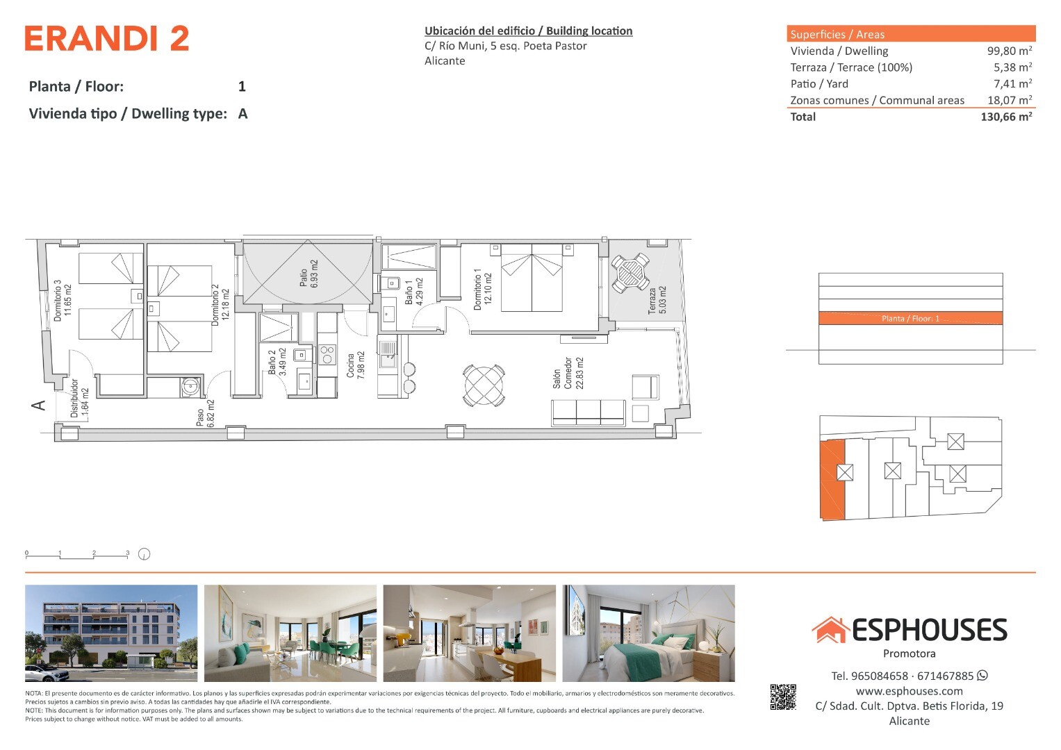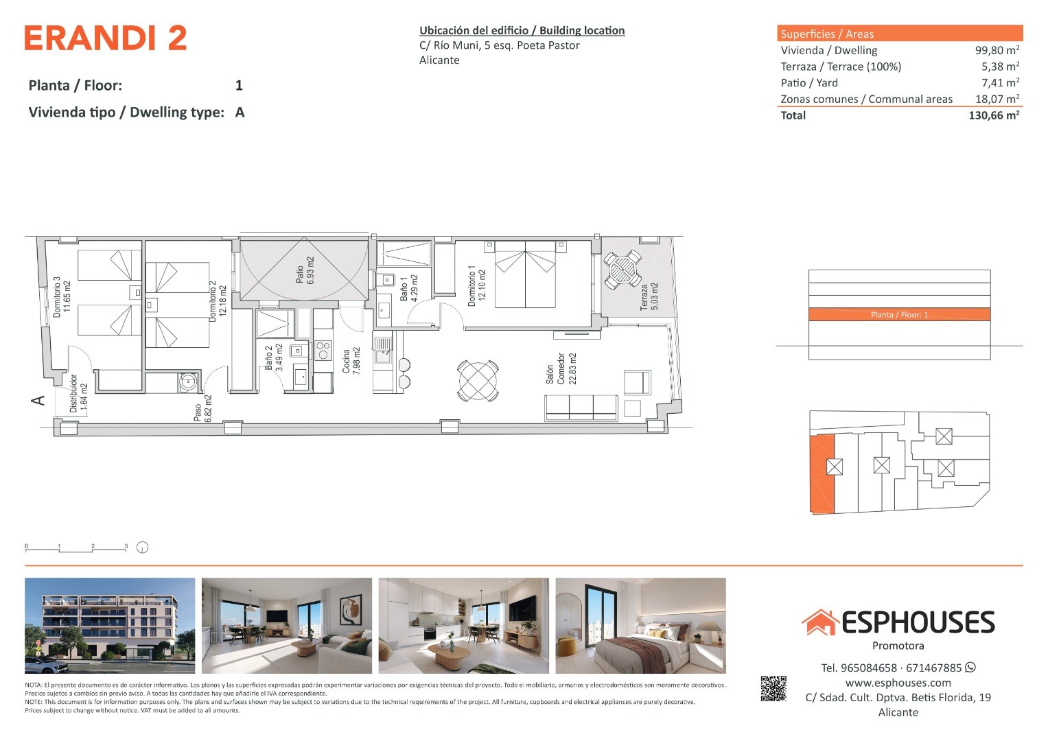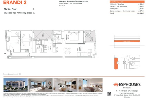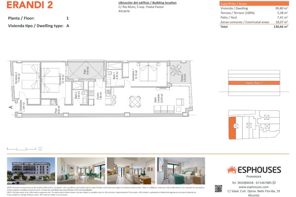 Dit nieuwbouwappartement op de eerste verdieping van gebouw ERANDI 2 heeft een royale bebouwde oppervlakte van 99,80 m², een praktische indeling en twee buitenruimtes: een terras van 5,38 m² en een patio van 7,41 m² – perfect om te genieten van het mediterrane klimaat van Alicante.