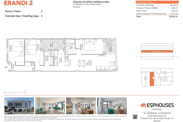 Dit nieuwbouwappartement bevindt zich op de eerste verdieping van gebouw ERANDI 2 en heeft een bebouwde oppervlakte van 95,40 m². Het ontwerp combineert comfort, functionaliteit en buitenruimtes die ideaal zijn om te genieten van het mediterrane klimaat. Het beschikt over een terras van 4,85 m² en een patio van 7,41 m².