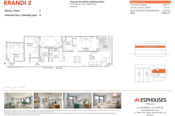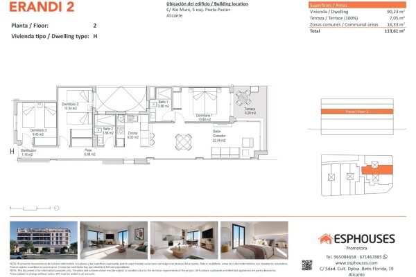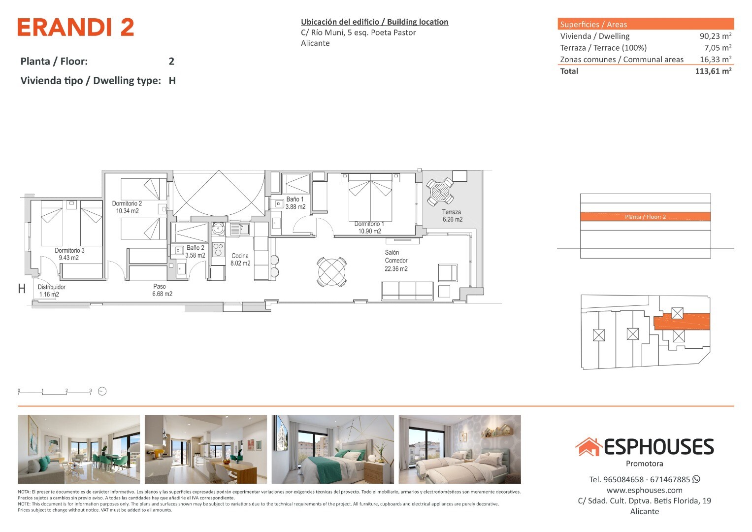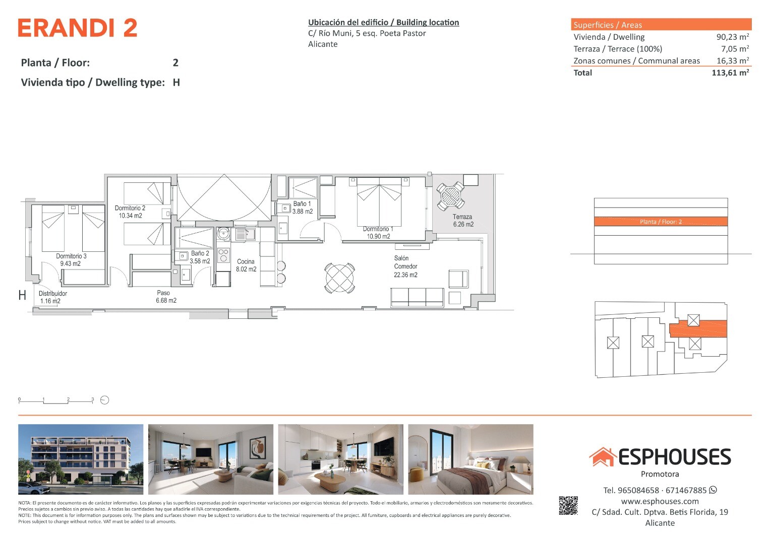 Op de tweede verdieping van het gebouw ERANDI 2 bevindt zich deze lichte nieuwbouwwoning, gelegen in de bekende wijk La Florida — een goed verbonden buurt met alle voorzieningen in Alicante. Met 90,23 m² bebouwd oppervlak beschikt de woning over drie slaapkamers met inbouwkasten, twee badkamers, een woon-eetkamer met open keuken en een zonnig terra...s van 7,05 m² op het zuiden, ideaal om de hele dag van de zon te genieten.