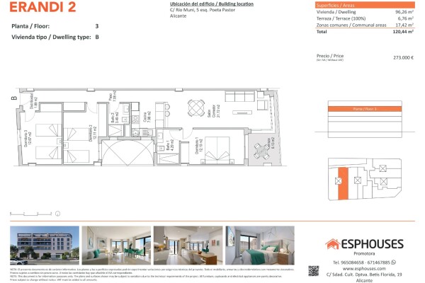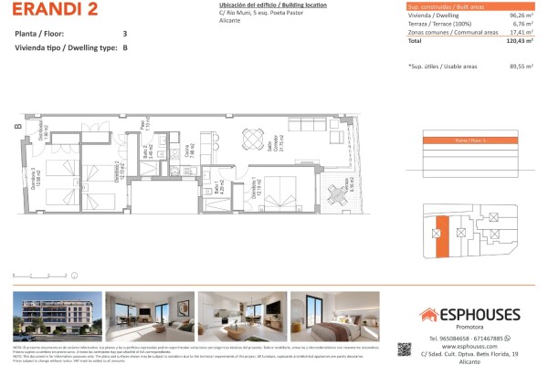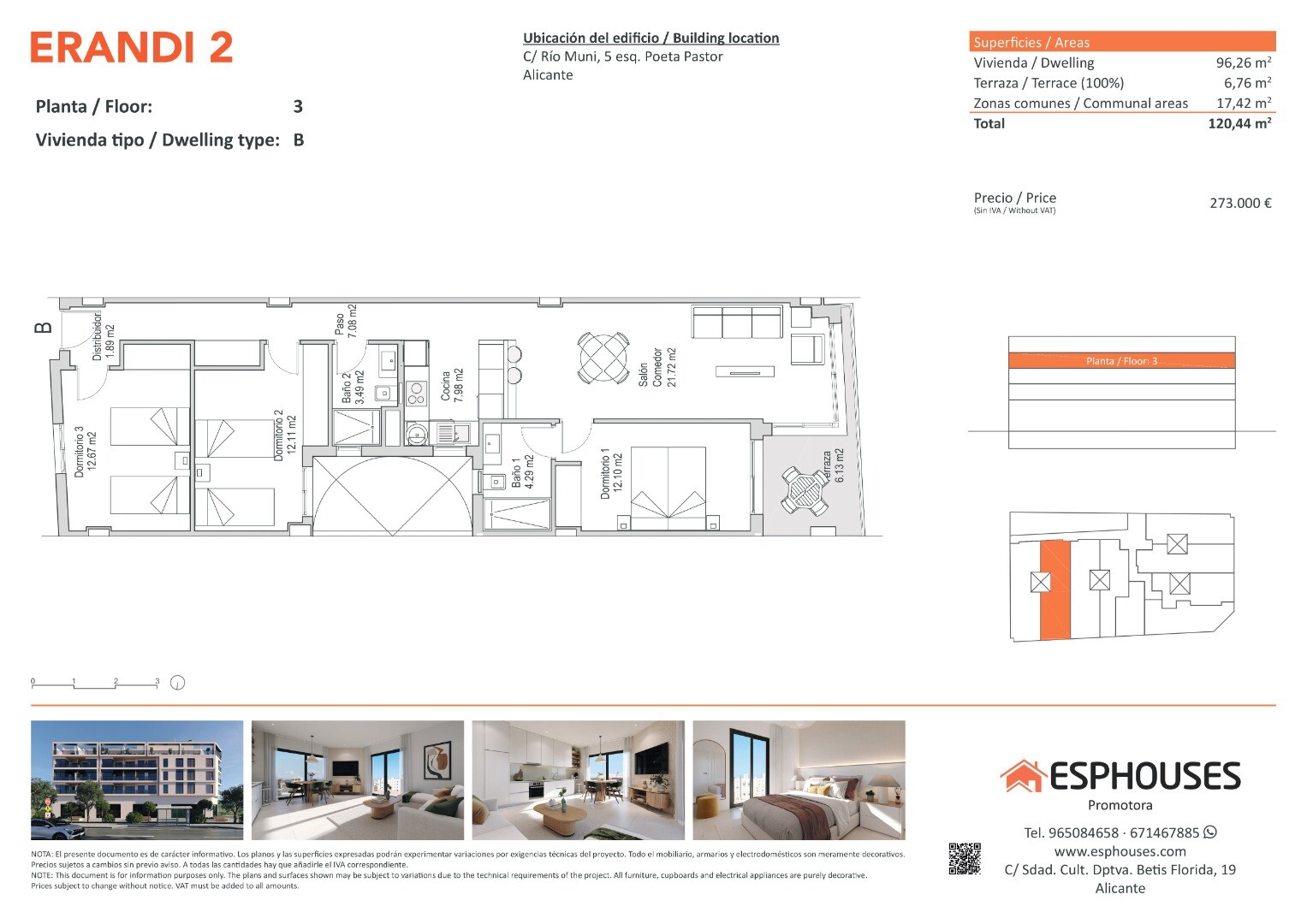 Deze lichte woning op de derde verdieping van het gebouw ERANDI 2 combineert ruimte, modern design en een uitstekende ligging in de goed verbonden wijk La Florida in Alicante. Met 96,26 m² beschikt het appartement over drie slaapkamers met inbouwkasten, twee badkamers, een ruime woon-eetkamer met open keuken en een privéterras van 6,76 m² op het we...sten – perfect voor de middagzon.