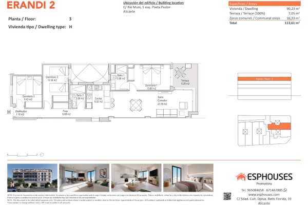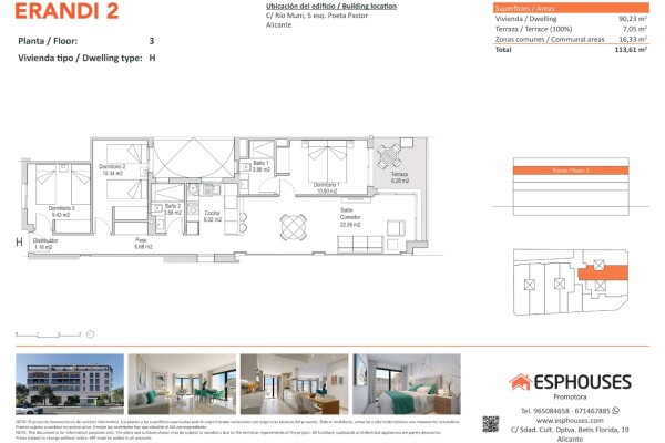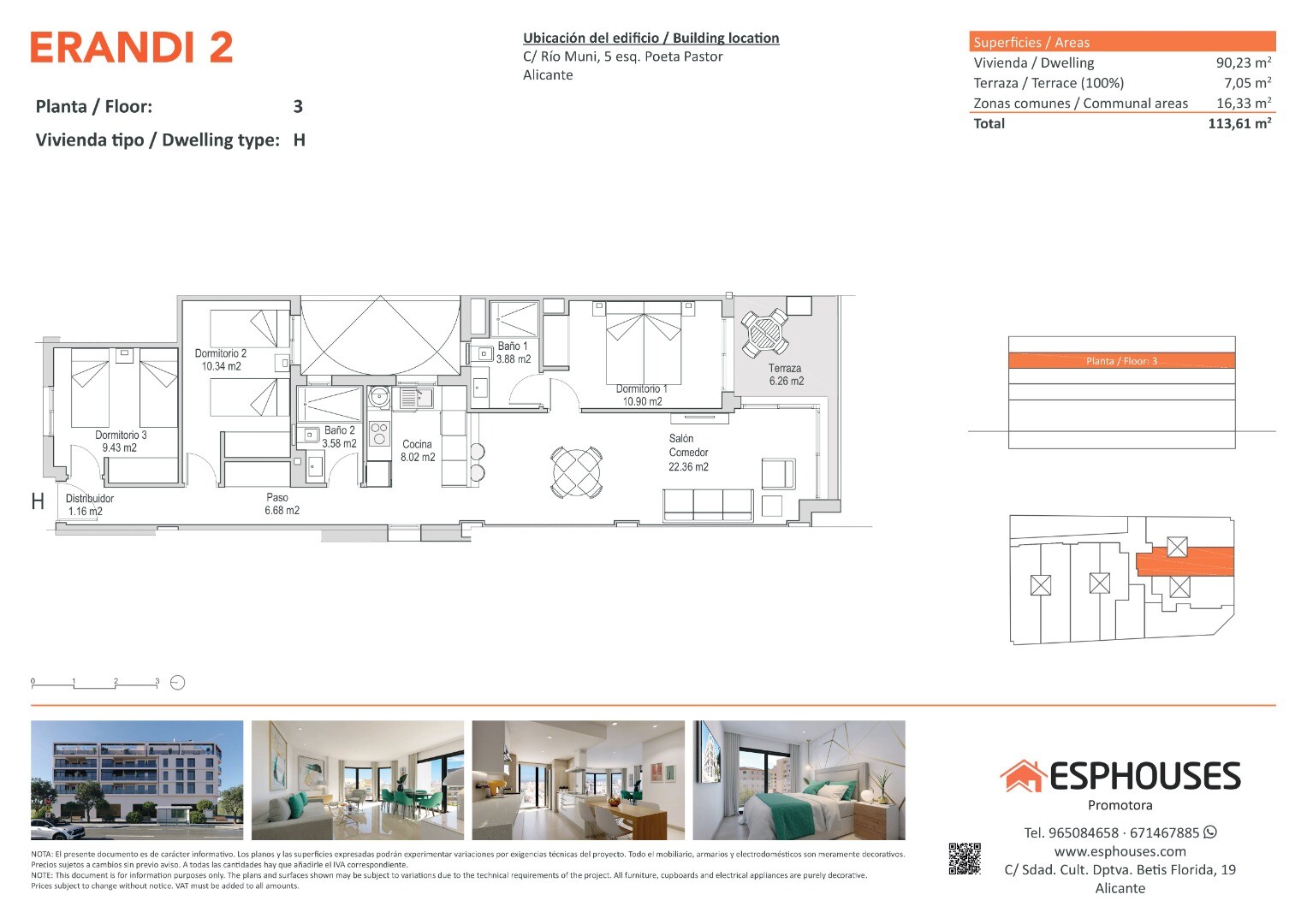 Dit nieuwbouwappartement ligt op de derde verdieping van gebouw ERANDI 2 en heeft een bebouwde oppervlakte van 90,23 m². Dankzij het moderne, functionele ontwerp en de uitstekende zuidligging is dit een ideale woning in de geliefde en goed verbonden wijk La Florida in Alicante.