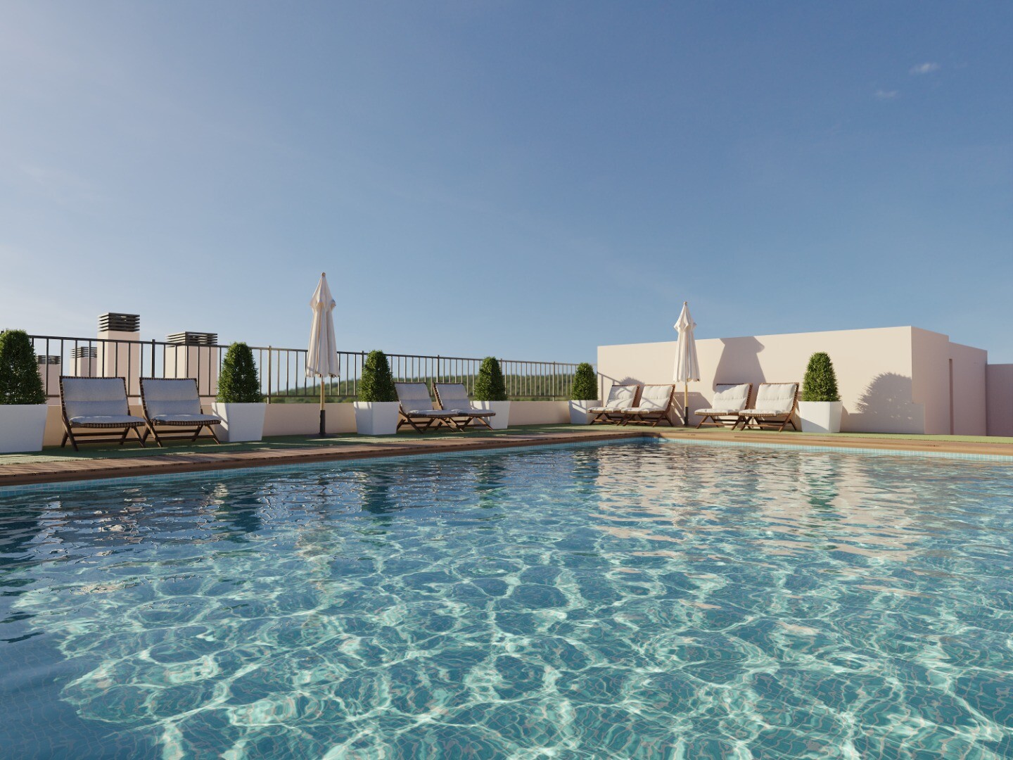 Het gebouw beschikt over hoogwaardige afwerkingen, moderne voorzieningen en een voorbereide installatie voor airconditioning. Bewoners kunnen ook gebruikmaken van het gemeenschappelijke zwembad op het dak, met optionele parkeerplaatsen en bergingen.