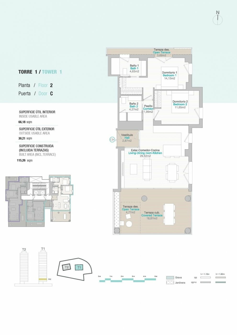 Grote gemeenschappelijke ruimtes met tuinen, zwembad, paddle tennis, kinderzone. Op de 11e verdieping van toren 1: infinity zwembad, sauna, fitnessruimte en chill ruimte met uitzicht op zee.