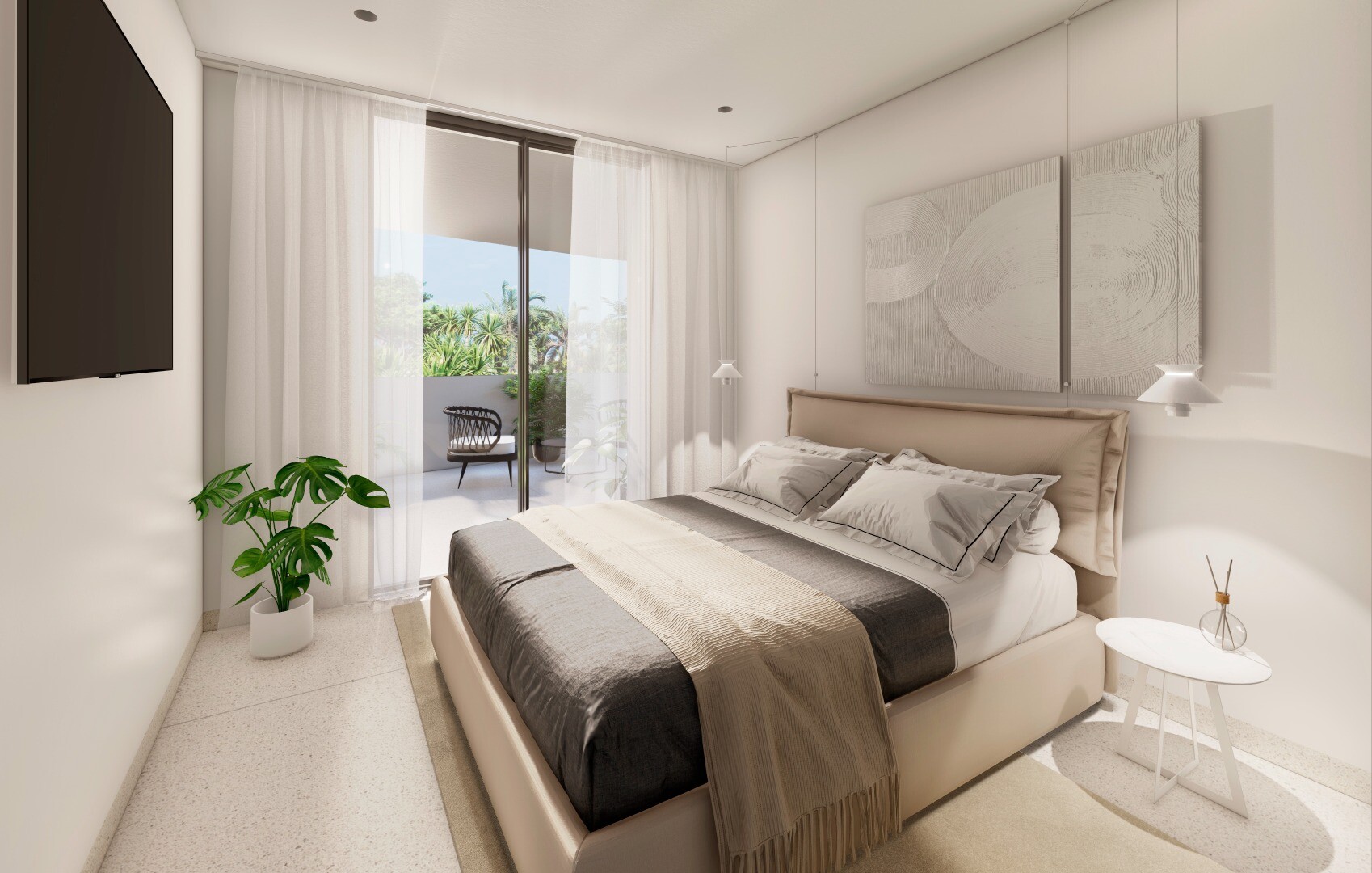 Appartementen met woonkamer, keuken, 2 slaapkamers en 2 badkamers en grote terrassen in elk appartement.