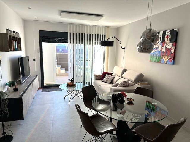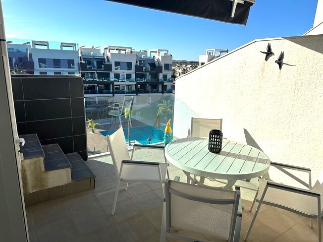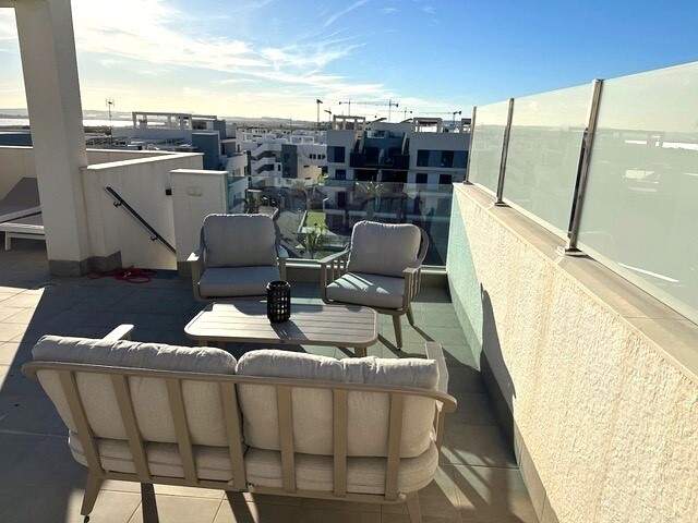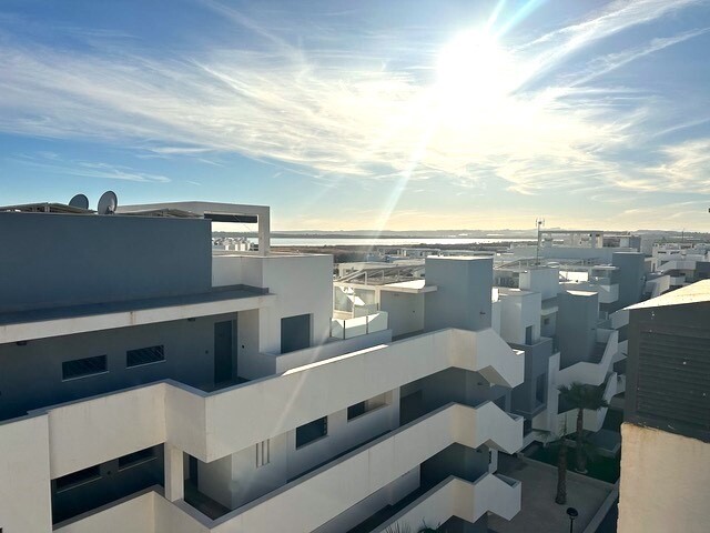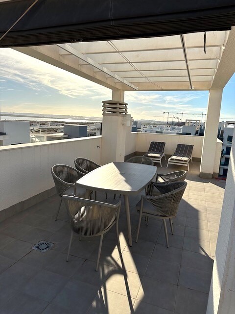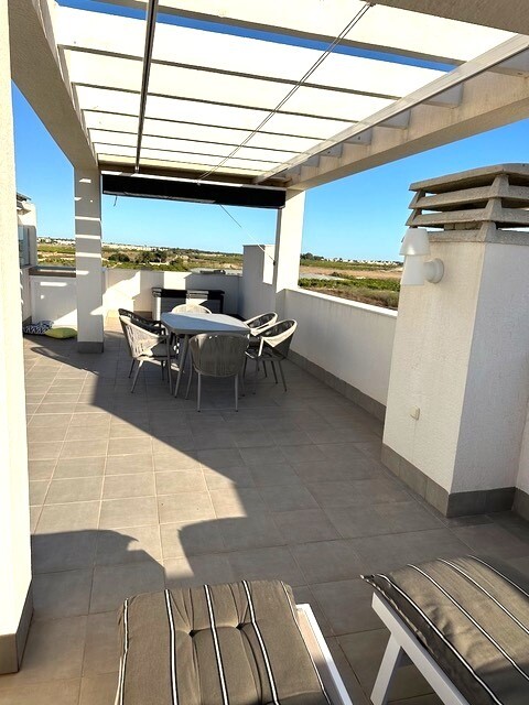 Solarium van 77m2. Dit prachtige hoekpenthouse is een waar juweeltje in de gewilde urbanisatie El Raso, op slechts enkele minuten van Guardamar del Segura met de goudgele zandstranden. Met een bevoorrechte locatie en een prachtig uitzicht biedt dit pand een uitzonderlijke levensstijl. Geniet van een prachtig uitzicht over citroenboomgaarden en zout...lagunes. Rust en natuurlijke schoonheid zijn gegarandeerd. Dit penthouse is zorgvuldig onderhouden en ziet eruit als nieuw. Klaar om in te trekken en te genieten. Het ruime zonneterras van 77m2 is de perfecte plek om te ontspannen terwijl u de zon ziet ondergaan boven de zoutvlakten. Stel je buitendiners en onvergetelijke momenten voor met vrienden en familie. Uitgerust met materialen van topkwaliteit, merk A-apparatuur en hoogwaardig meubilair, biedt dit penthouse comfort en elegantie. Warmtepanelen, zonwering, luifel op het terras, tuinmeubilair en een ondergrondse parkeerplaats. Geniet van twee prachtige zwembaden, fitnessruimte, spa-wellnessruimte, minigolf, tafeltennis en petanque banen. Dit is een kant-en-klaar appartement met alles wat u nodig heeft om de mediterrane levensstijl te leven. Mis deze unieke kans niet!