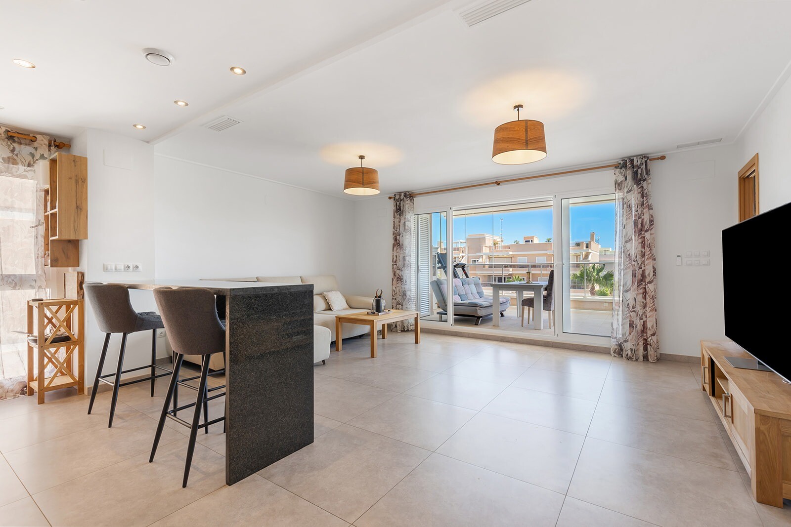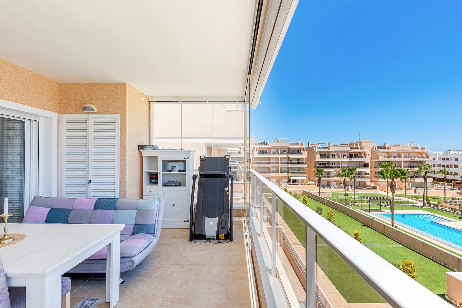 Dit prachtige appartement heeft drie slaapkamers, waarvan één met en-suite badkamer en directe toegang tot het terras met uitzicht op de gemeenschappelijke tuin en zwembad. Een ruime woonkamer met open keuken en directe toegang tot het terras van 16m2.