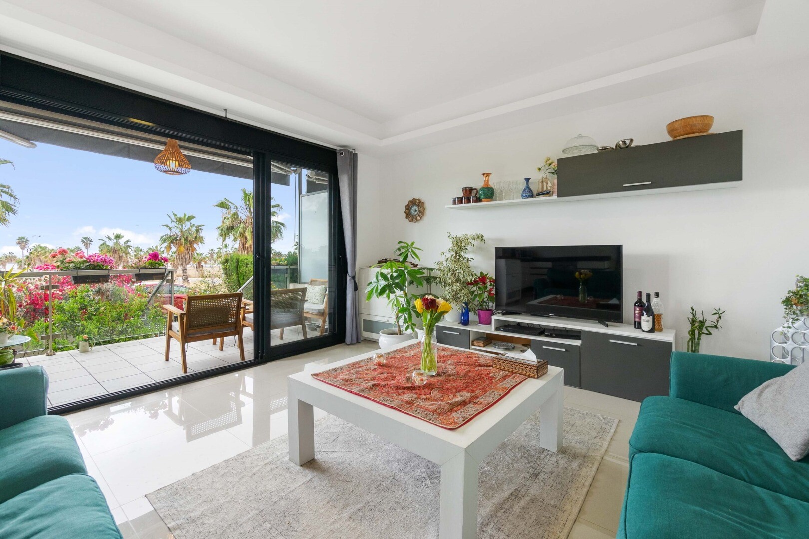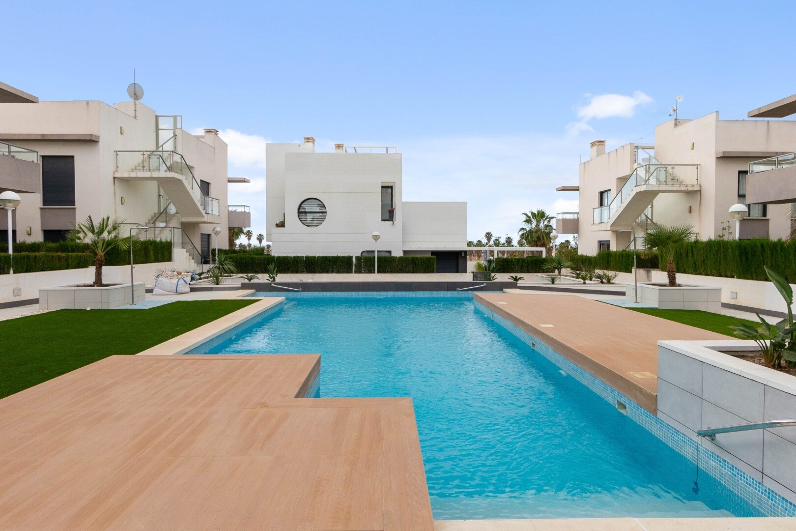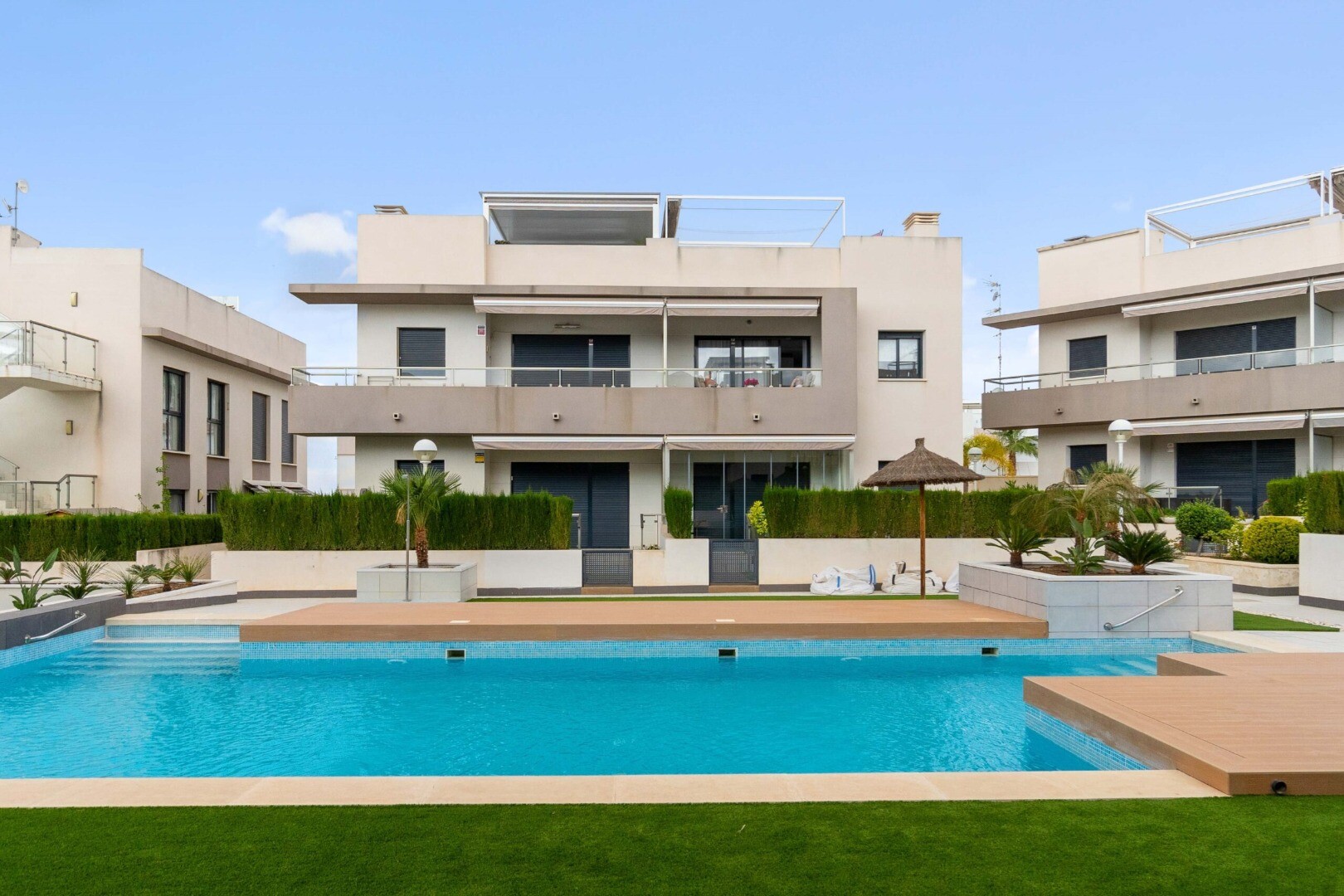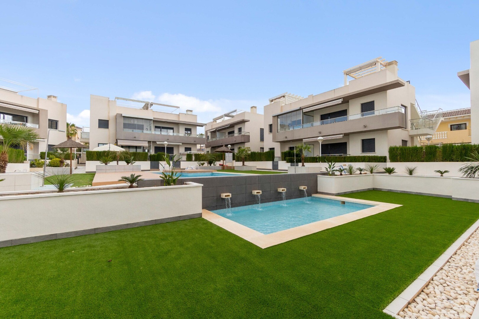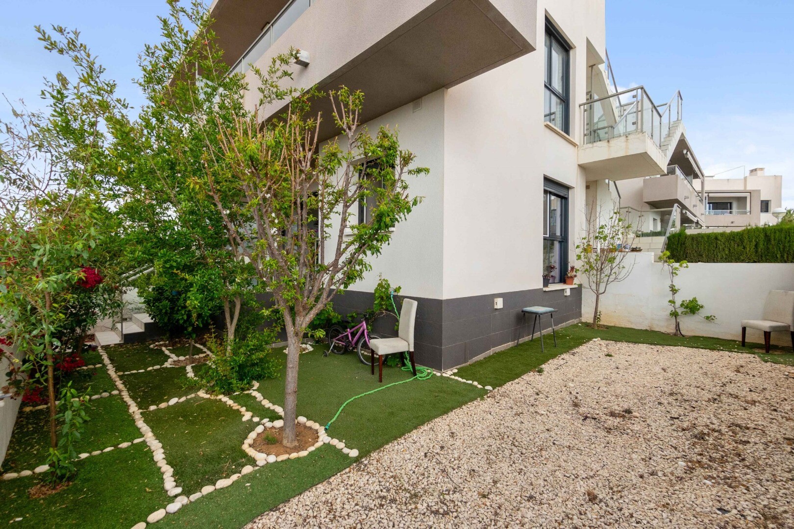 Gelijkvloers appartement in Rojales, Cuidad Quesada. Het appartement heeft een tuin van 43m2 en een terras van 10m2, het heeft 2 slaapkamers, 2 badkamers, keuken en een woonkamer. De woning beschikt tevens over een open parkeerplaats. Het is gelegen in een complex met gemeenschappelijk zwembad voor kinderen en volwassenen.