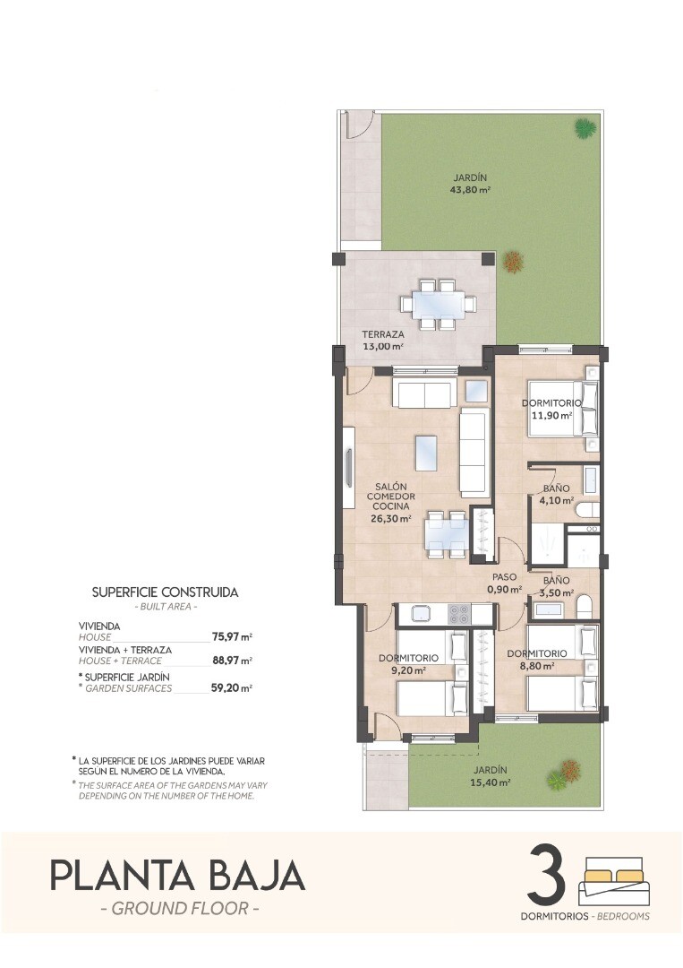 De residentie bestaat uit twee typen woningen: een op de begane grond met twee slaapkamers, twee badkamers, twee ruime tuinen en een... parkeerplaats; en een op de bovenste verdieping met twee slaapkamers, twee badkamers, een groot solarium en een parkeerplaats. De woningen op de bovenste verdieping bieden uitzicht op zee. In lijn met onze eerdere ontwikkelingen hebben de woningen ruime interieurs. Door de ruimere afmetingen kan er ook optioneel gekozen worden om een woning met drie slaapkamers te bouwen.