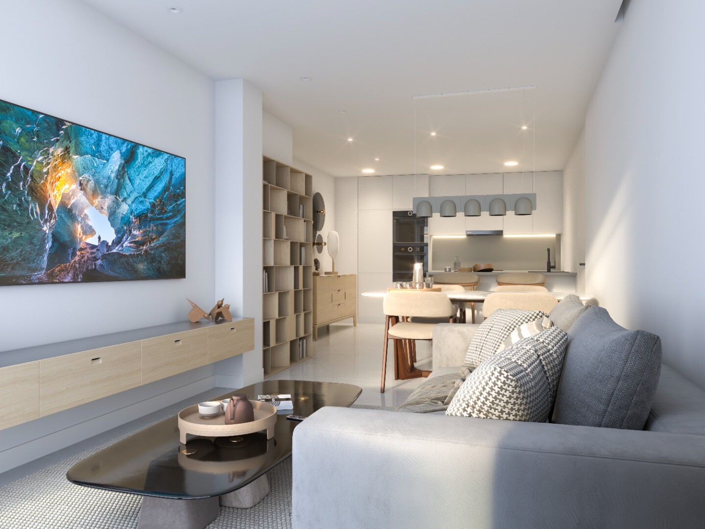 - Kookeiland met geïntegreerd tv-meubel.
