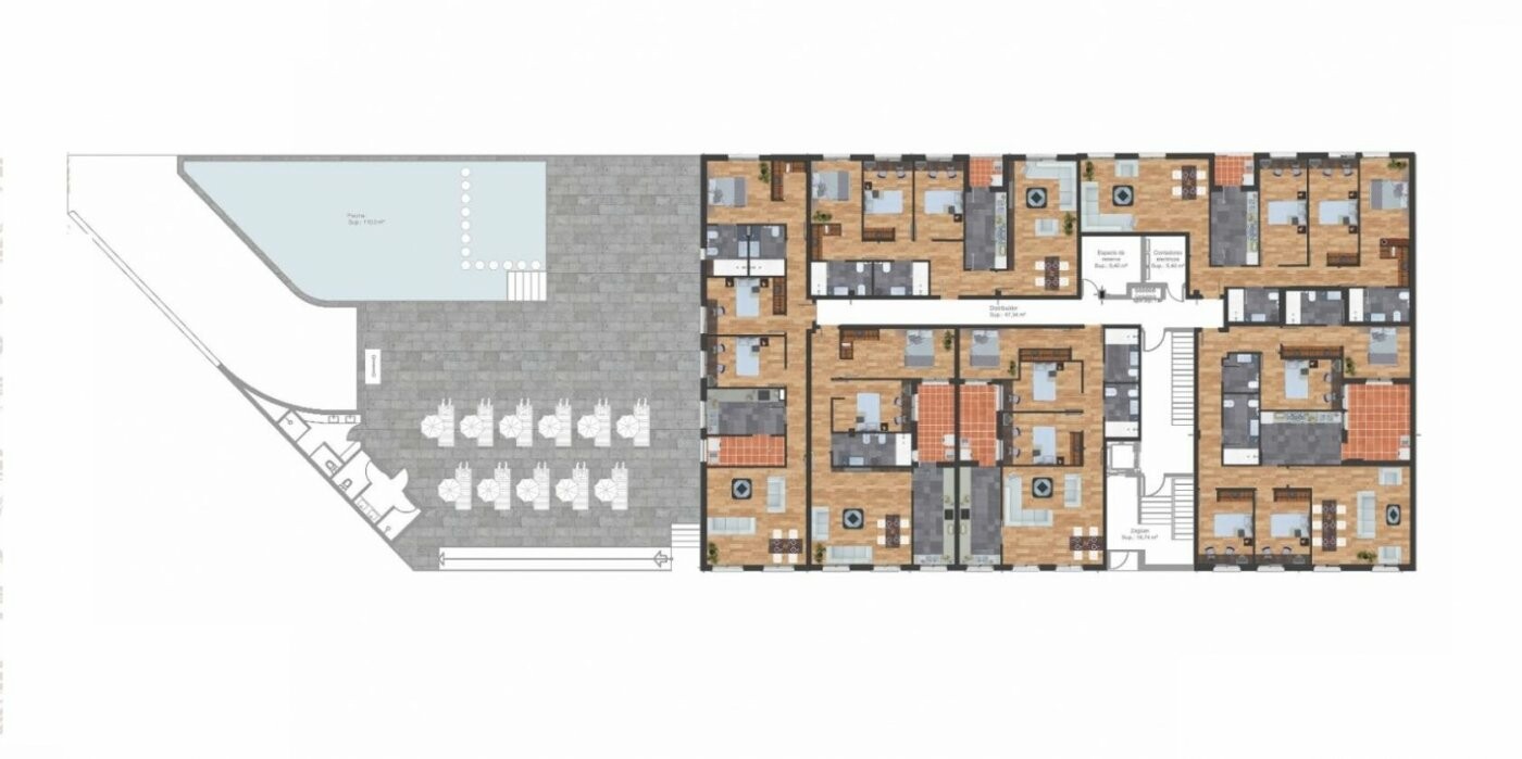Complex heeft een gemeenschappelijk zwembad en alle appartementen hebben een eigen solarium, een ondergrondse garage en een berging. Het g...ebouw heeft 3 verdiepingen, er zijn 6 appartementen op de begane grond en 8 appartementen op de eerste en tweede verdieping.