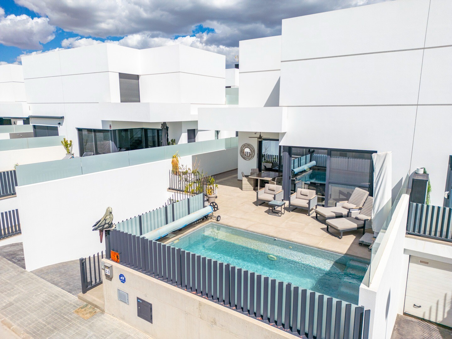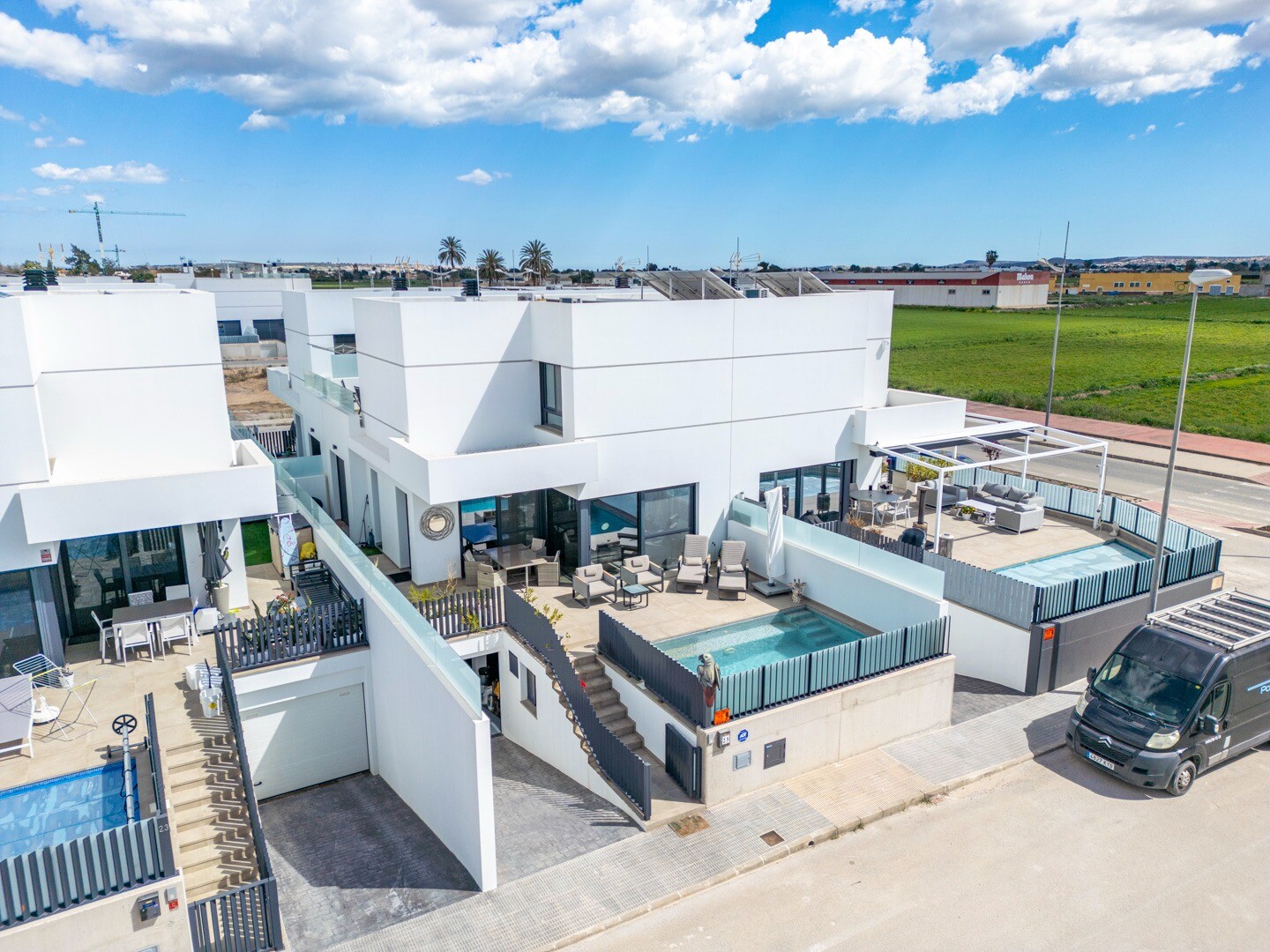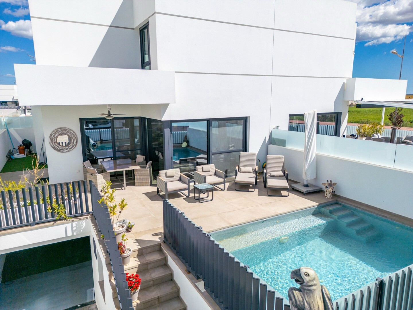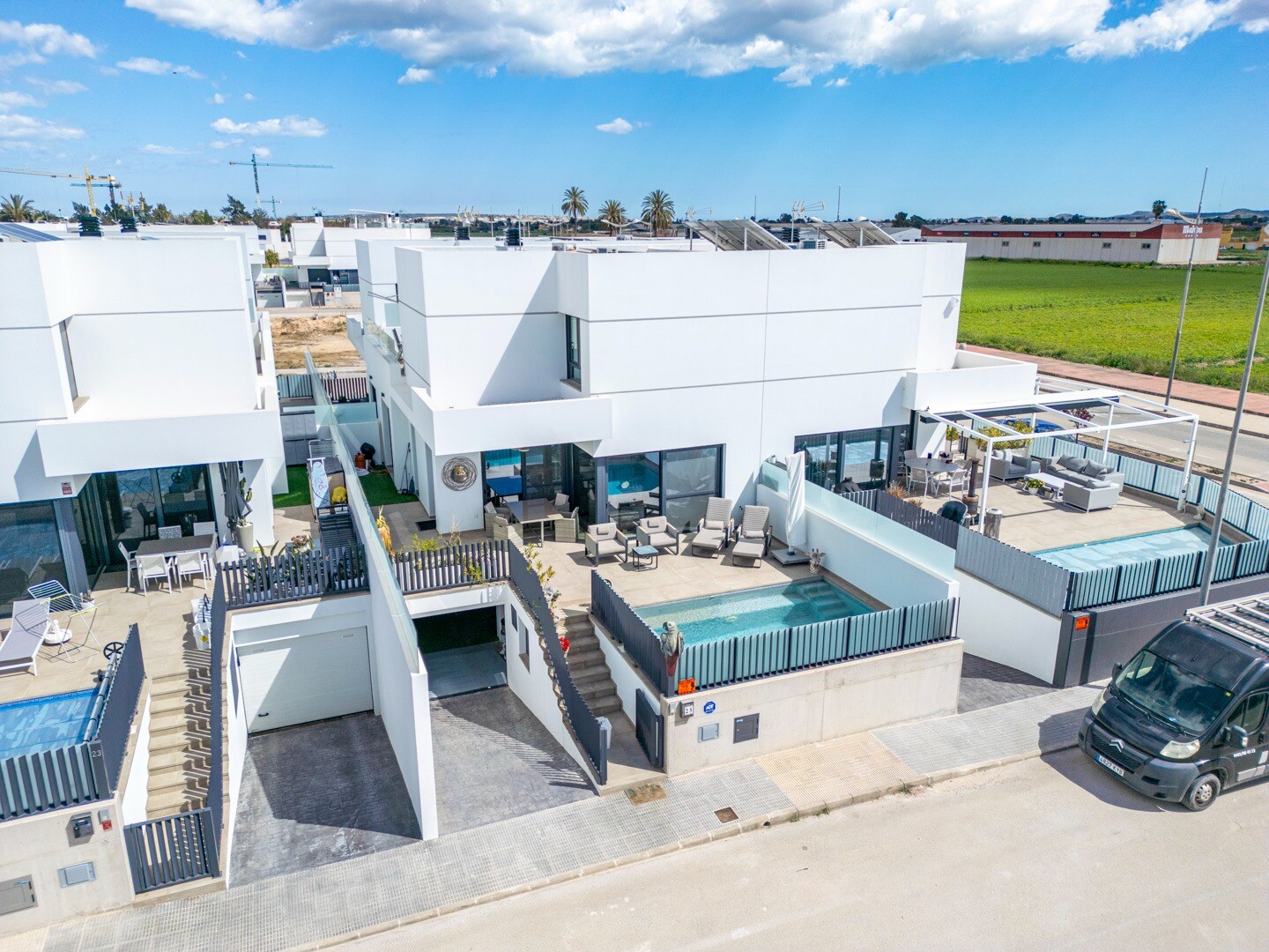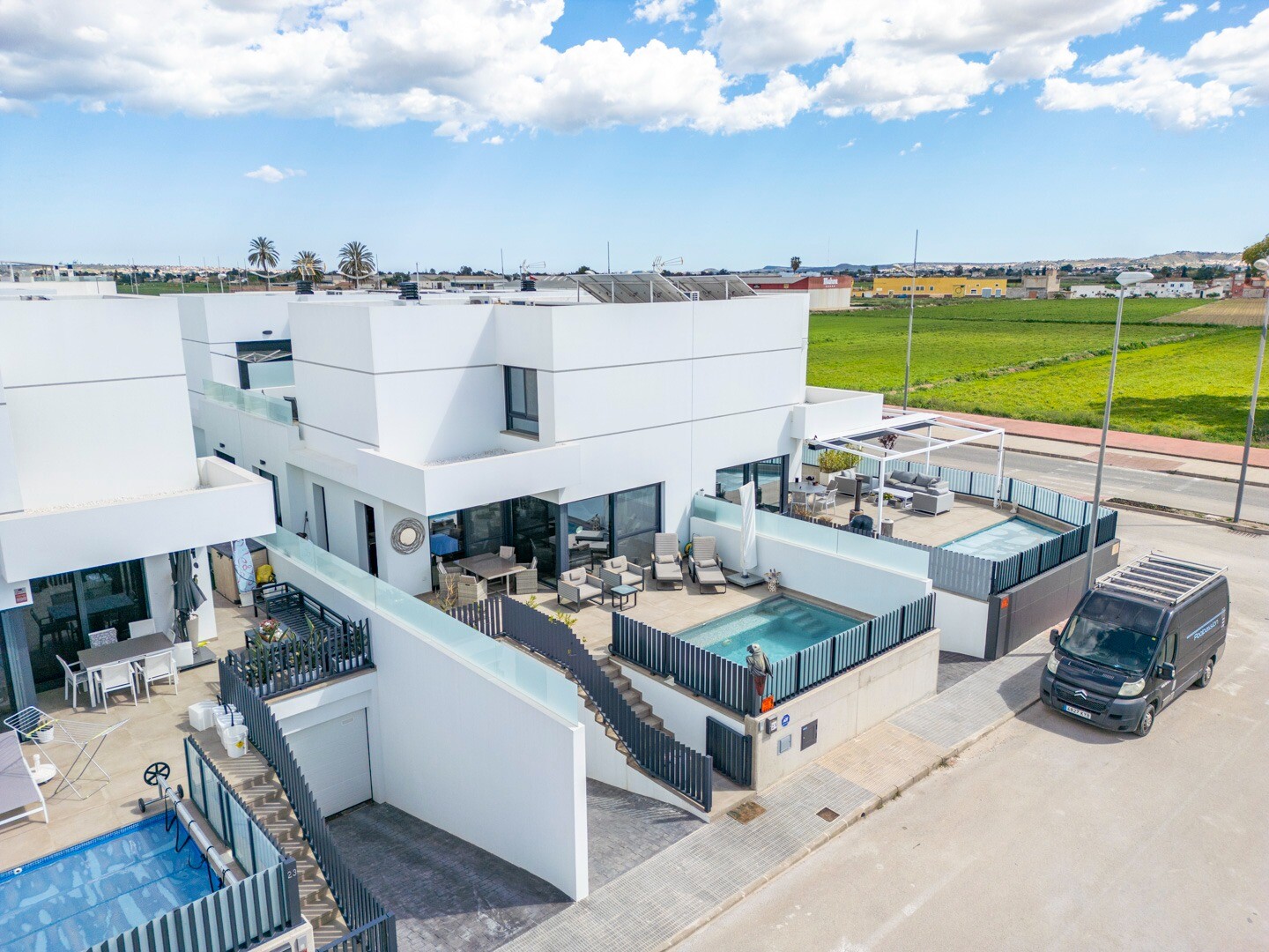 Prachtige nieuwe halfvrijstaande villa met verwarmd zwembad en dakterras in Dolores. De huidige eigenaar heeft het zelfs laten ombouwen naar een zout zwembad. De villa is van maart 2023 en voorzien van alle denkbare luxe. Er is gekozen voor luxe materialen en de woning is direct instapklaar. Met een lichte woonkamer, een mooie open keuken en een sl...aapkamer op de begane grond met daarnaast een dressing en een ensuite badkamer en een apart gastentoilet (is redelijk uniek in Spanje) Op de 1e verdieping treffen we 2 slaapkamers en een 2de badkamer en toegang tot een aansluitend terras. Met een grote kelderruimte onder de woning, welk voor verdere diverse doeleinden gebruikt kan worden, heeft deze woning zeer veel ruimte en luxe. De woning is gelegen in een nieuwbouw wijk waar nog diverse huizen in aanbouw zijn, maar op deze woning hoeft u geen jaar te wachten. De 15km lange goudgele zandstranden van Guardamar del Segura zijn bereikbaar in een 20-tal minuten. De luchthavens van Alicante en Murcia - Corvera zijn respectievelijk bereikbaar in een 30-tal minuten voor Alicante en een 45-Tal Minuten voor Murcia-Corvera.