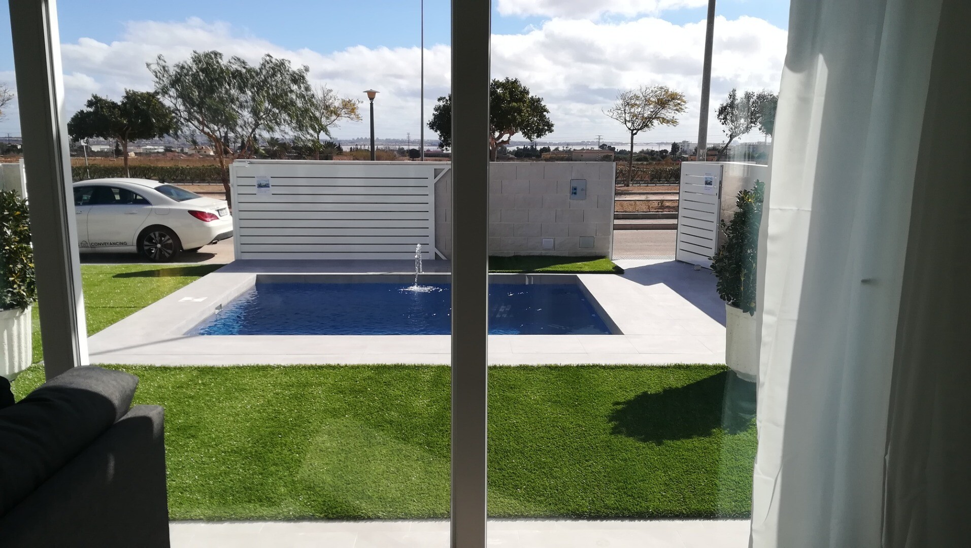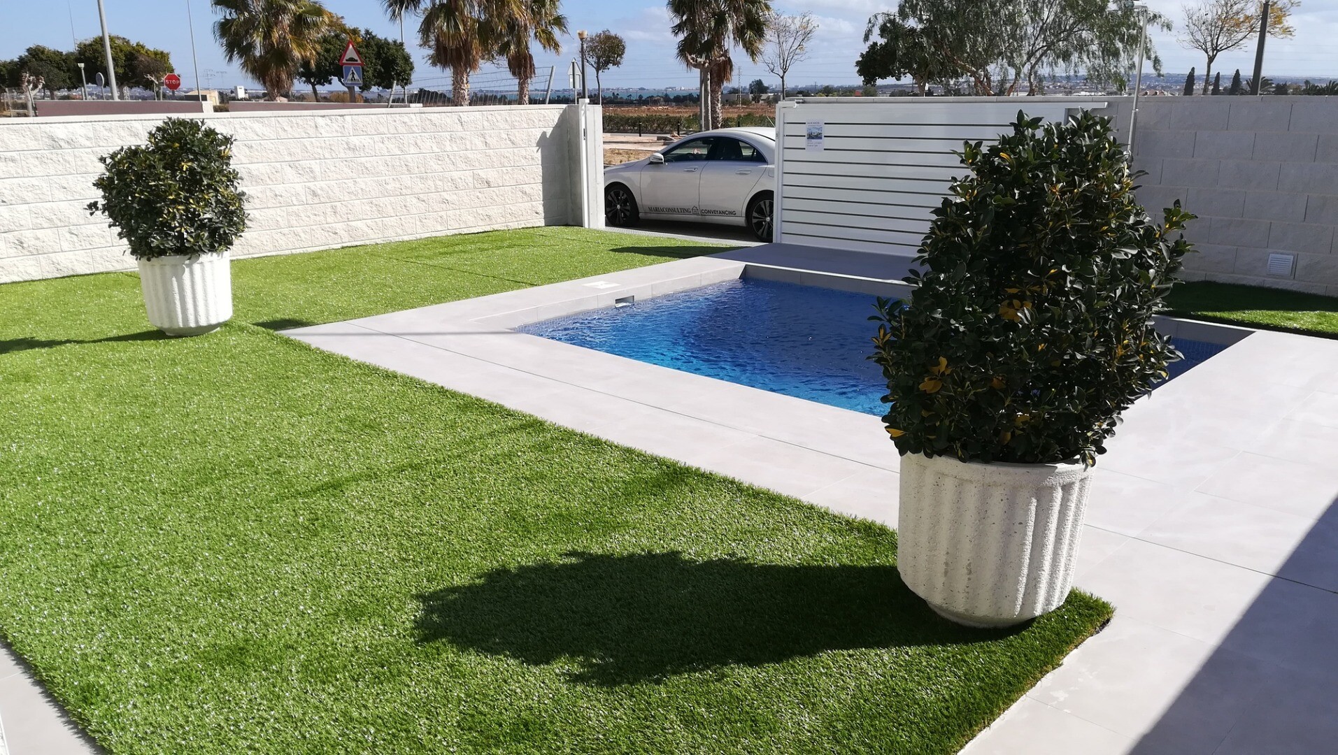 Mooie gelijkvloers villa's met afgewerkt zwembad, tuin, solarium, elektrische rolluiken en gemotoriseerde poortopener met panoramisch zicht op de skyline en roze zoutmeren van Torrevieja.