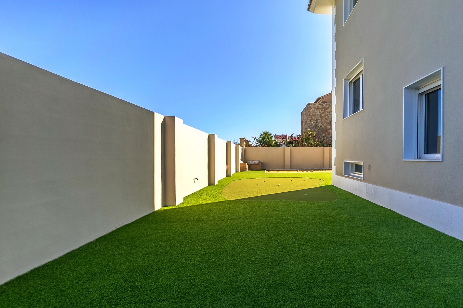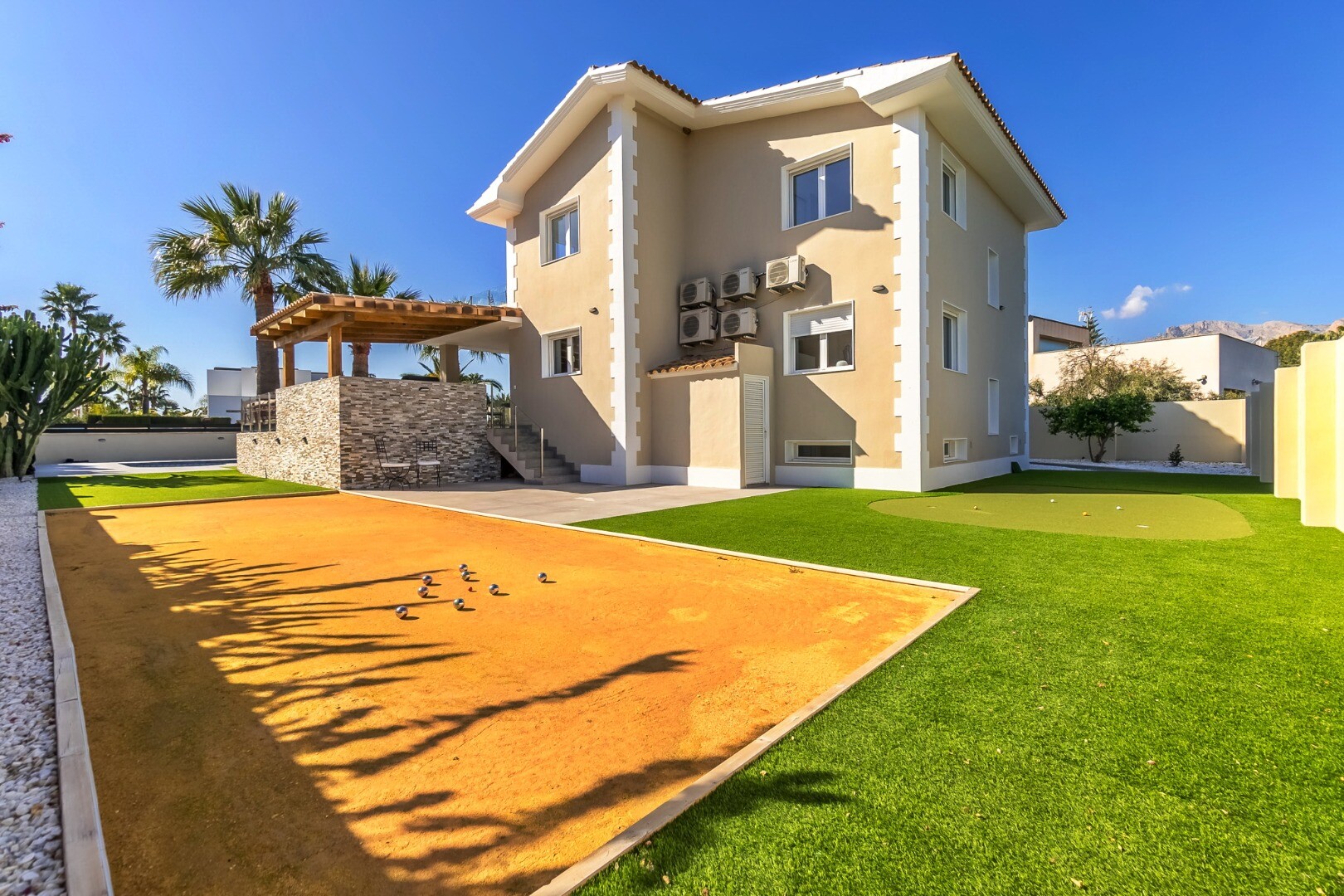 Buiten vindt u aangelegde tuinen, een buitenkeuken met barbecue, een pergola met loungegedeelte, een verlicht zwembad van 11 x 5 meter, een jeu de boulesbaan en een privé minigolfbaan.