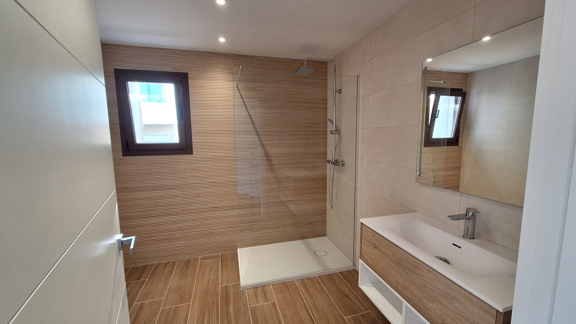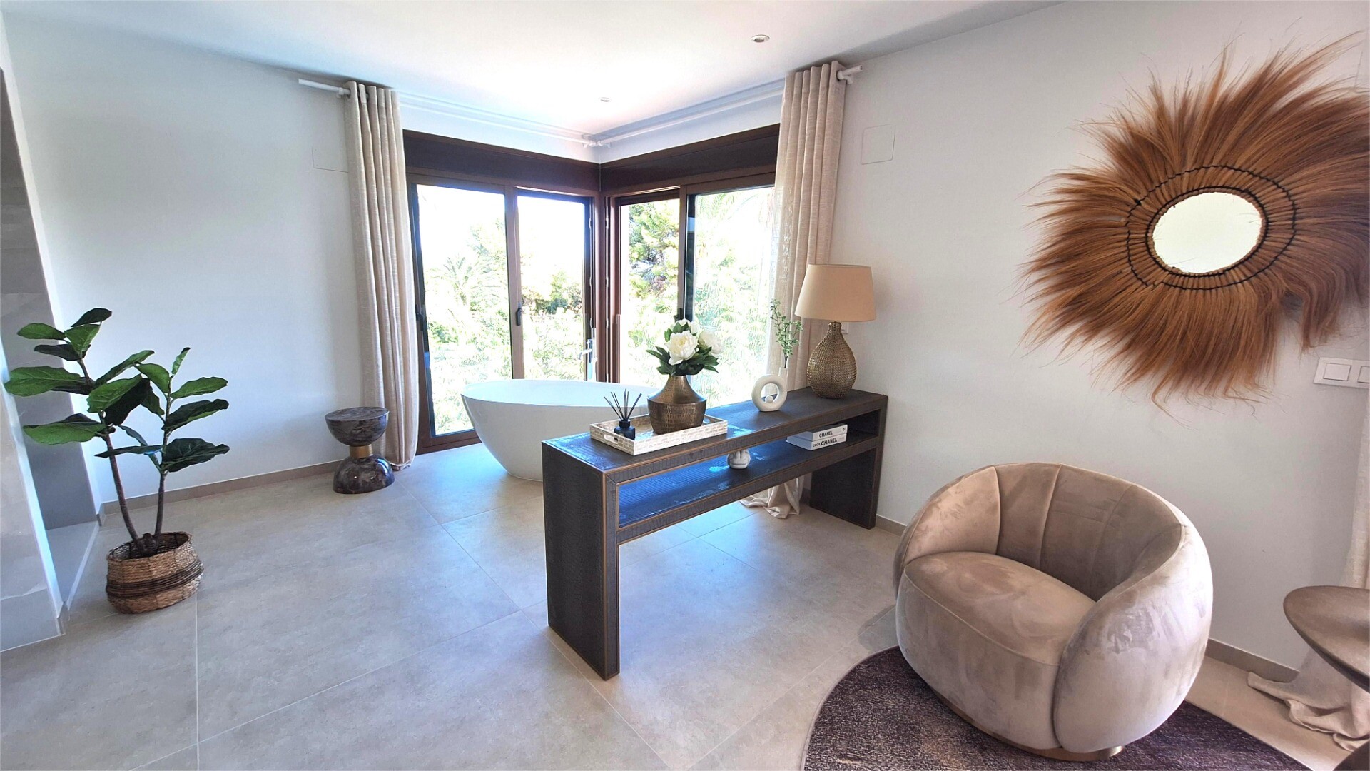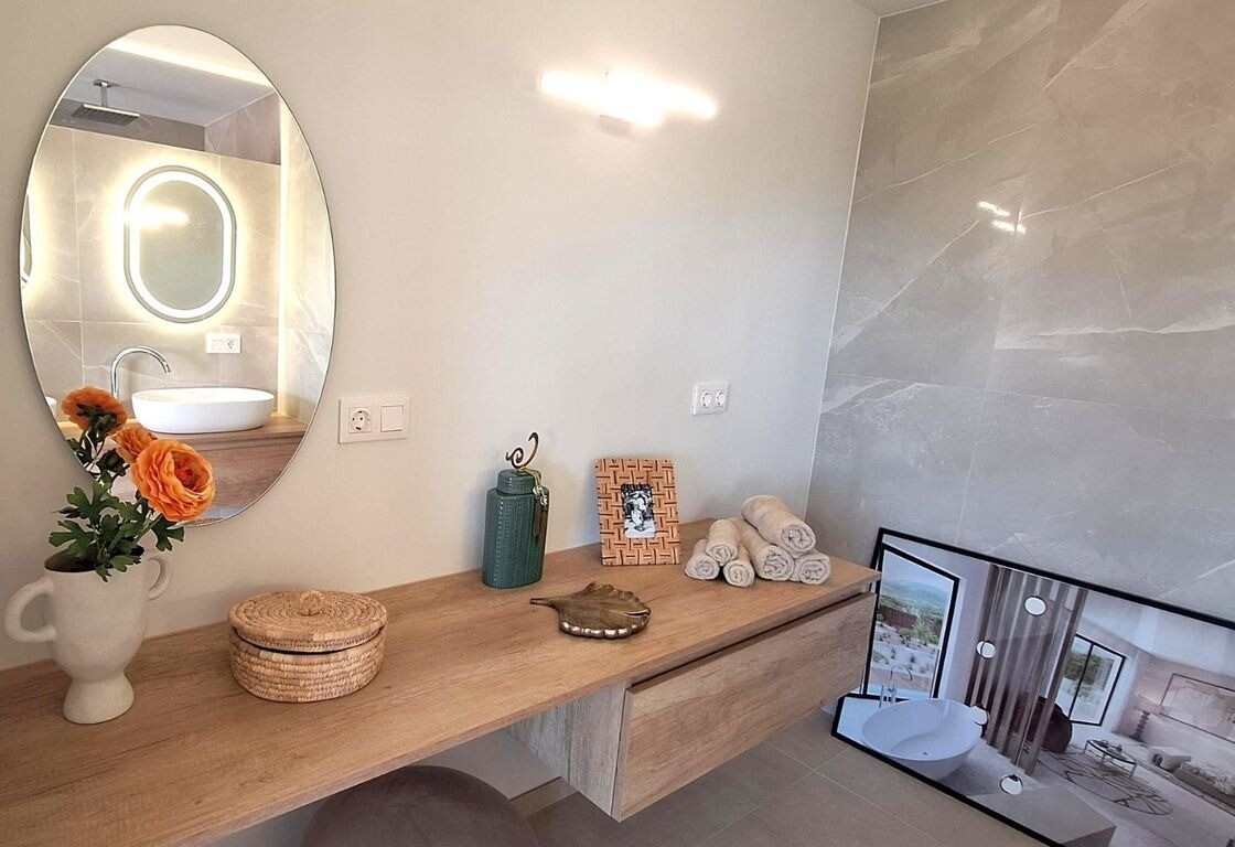 De hoofdslaapkamer beschikt over een elegante en-suite badkamer met een ligbad met prachtig uitzicht en een ruime douche, terwijl de andere slaapkamers ook directe toegang bieden tot moderne badkamers.