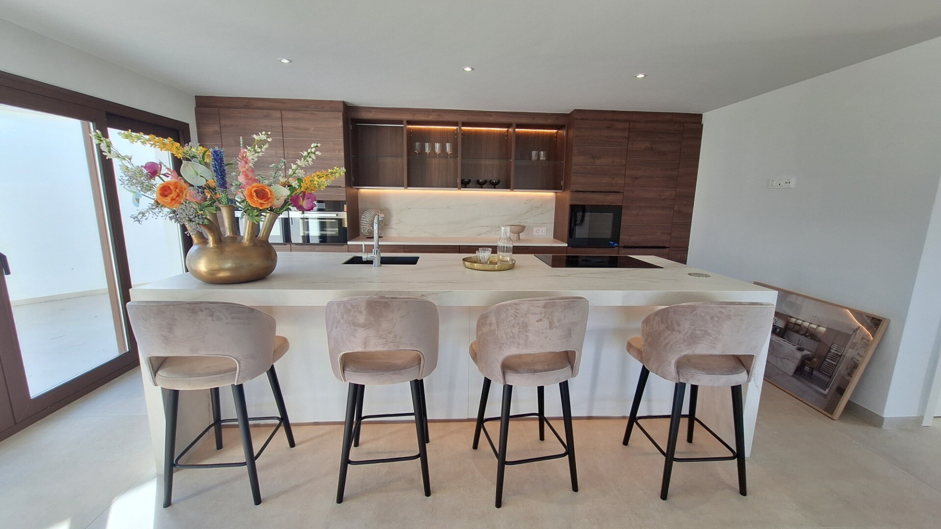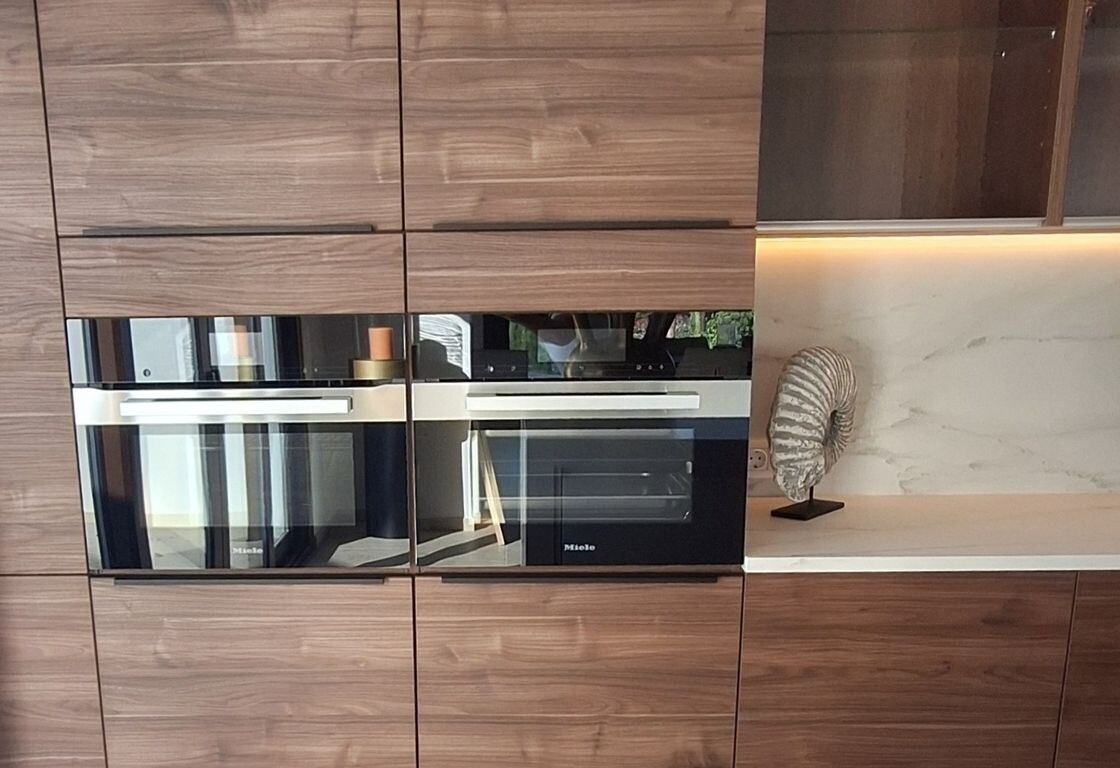 De grote woonkamer en eetkamer sluiten naadloos aan bij een moderne Amerikaanse keuken voorzien van hoogwaardige apparatuur.