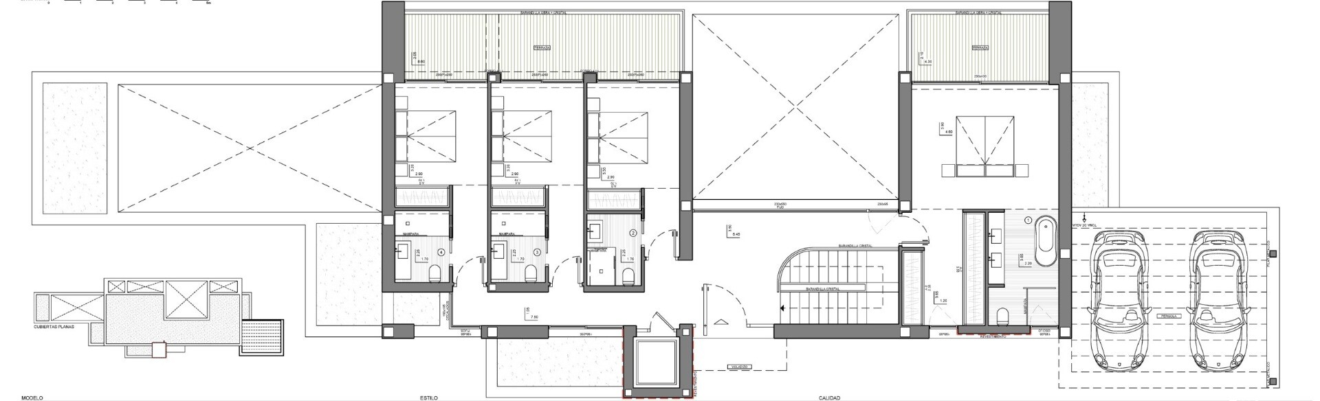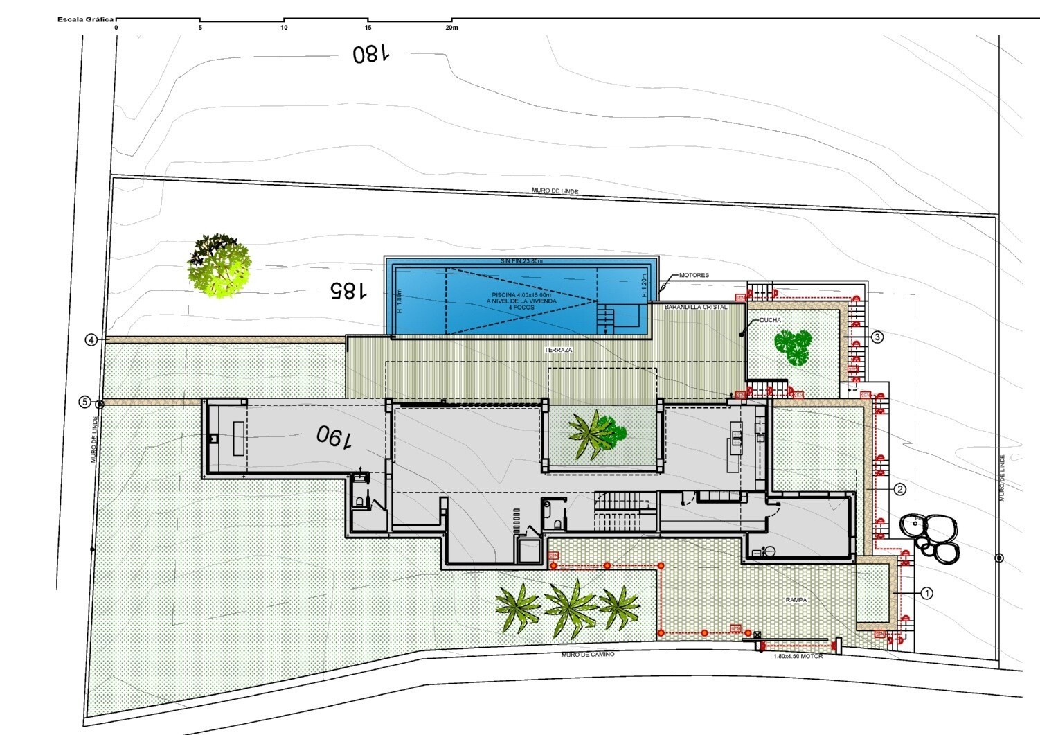De toegang tot het pand bevindt zich op het bovenste gedeelte van het perceel, waar een elegante voetgangersingang en een overdekte garage voor twee auto's te vinden zijn. Vanaf dit niveau verbinden zowel een buitentrap als een interne lift alle verdiepingen van de villa, wat zorgt voor comfort, toegankelijkheid en architectonische samenhang.