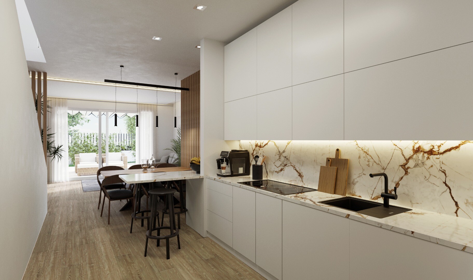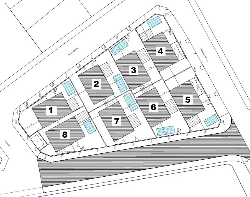 Kleine verkaveling van 8 vrijstaande villa's op privéperceel, bestaande uit twee verdiepingen en een kelder met Engelse patio. Open keuken, woon- en eetkamer, gastentoilet en slaapkamer met badkamer en suite, op de begane grond. Twee slaapkamers met badkamer en suite en groot terras van 36m2, op de eerste verdieping. Privétuin met zwembad en barbec...ueplek. Eigen parkeerplaats binnen het perceel. Oplaadstopcontact voor elektrische auto's. Individuele privétoegang vanaf de straat. Thermische en akoestische isolatie conform het nieuwe Technisch Bouwbesluit. Wit PVC buitenschrijnwerk en rolluiken. Interieur timmerwerk en kastfronten in gladde wit gelakte platen. Badkamers en keukens van vloer tot plafond betegeld met tegels/gres van topkwaliteit. Topkwaliteit sanitair en kranen, wc met ingebouwd reservoir. Porseleinen steengoed- of laminaatvloeren in het huis. Versterkte toegangsdeur. Volledig ingerichte keuken, boven- en onderkasten en granieten aanrechtblad of synthetisch agglomeraat (silestone of vergelijkbaar). Elektrische installatie volgens R.E.B.T. (Low Voltage Electrotechnical Regulations) met hoge elektrificatie (9,2 KW). Glad pleisterwerk op plafonds, verwijderbare plafonds in badkamers met airco-installatie. Geleid airconditioningsysteem (met warmtepomp) op de begane grond en eerste verdieping. Geforceerd ventilatiesysteem met warmteterugwinning. Een goede ventilatie van woningen zorgt voor een goede binnenluchtkwaliteit. Geforceerde ventilatie met warmteterugwinning verbetert het welzijn en comfort in huis. Het systeem recupereert de verwarmde binnenlucht, verwarmt de koude lucht die in de winter van buiten komt en koelt de warme