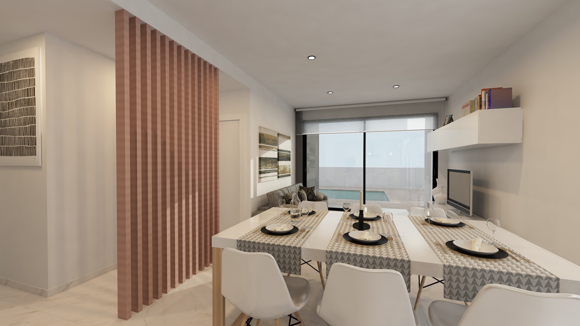 Op de eerste verdieping zijn er twee en-suite slaapkamers met hun terrassen. In de gang is er toegang tot het solarium, dit is het platte dak van de woning.