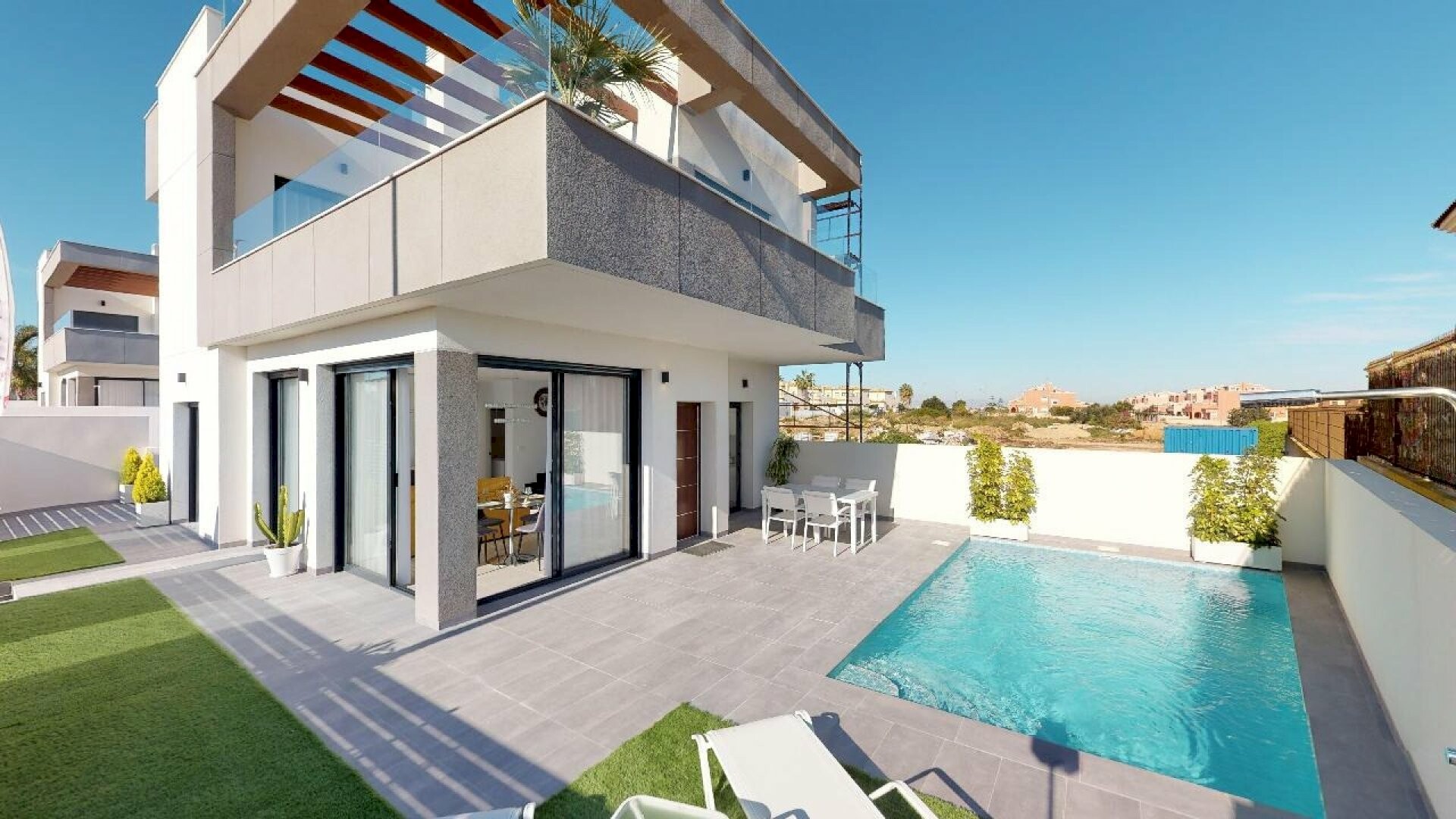 Nieuwe promotie Onafhankelijke Chalets in Los Montesinos, 30 minuten van de luchthaven van Alicante, in de buurt van de prachtige stranden van Guardamar del Segura, golfbanen, winkelcentra. De Residential bestaat uit 6 onafhankelijke villa's met privé zwembad, in de lucht heeft een veelheid aan diensten. Zeer heldere en warme distributie. Volledig ...ingerichte keuken met apparatuur, tuin, woonkamer, twee badkamers en toilet, slaapkamer met badkamer en kleedkamer. Terras, individueel zwembad en solarium. Met pre-installatie van airconditioning, PVC-beglazing met dubbele beglazing, allemaal met exclusieve afwerkingen