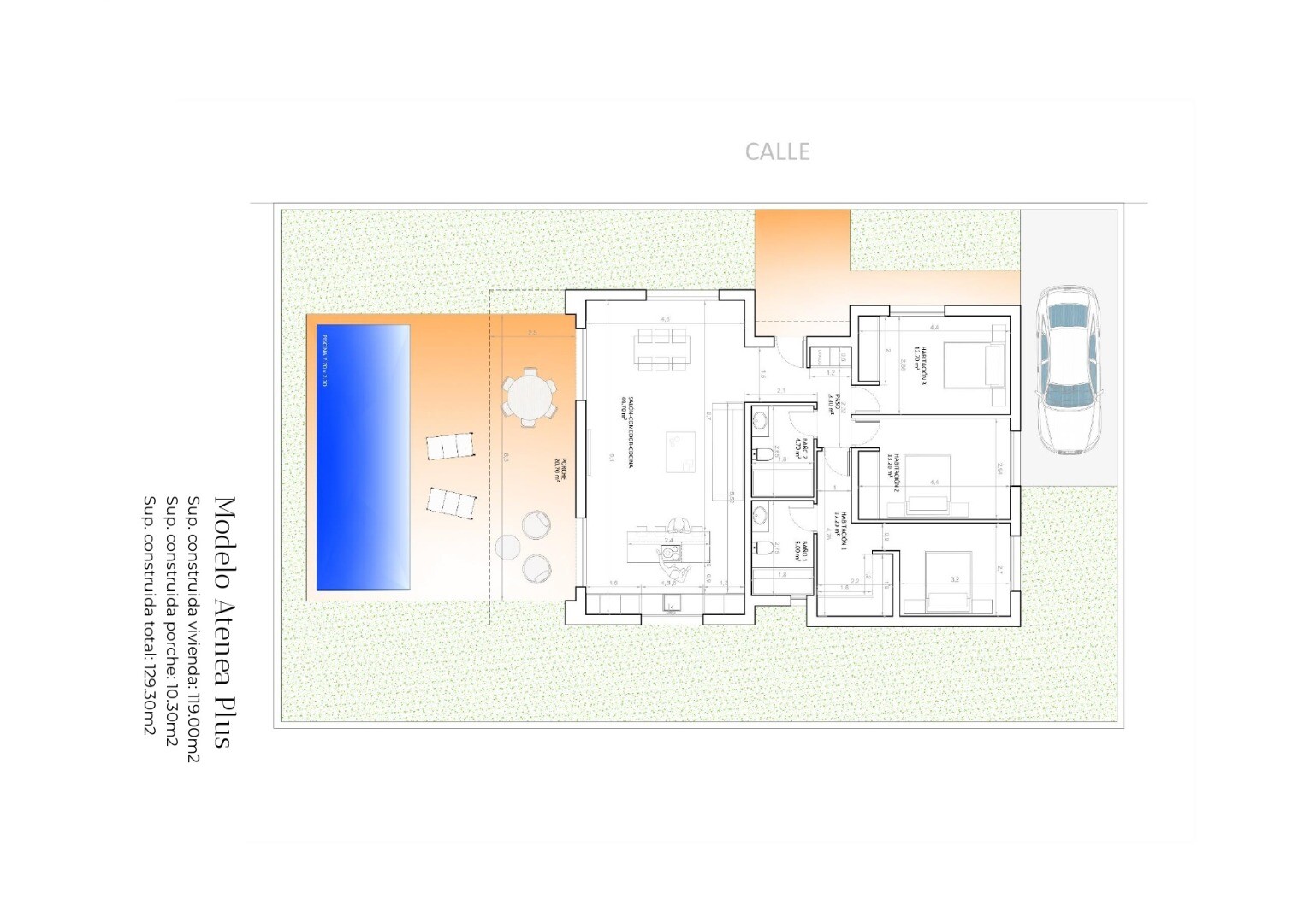 Waar we een ruime woon-eetkamer vinden met een open keuken (inclusief keukenmeubilair, geen apparaten) die via twee grote ramen in verbinding staat met de grote moderne veranda, die toegang geeft tot de buitentuin en waarom niet... tot eventueel het zwembad. Als extra ruimte heeft de villa een wasruimte die strategisch is geplaatst in de verdeling van het huis, waar het vanaf elk punt in het huis zeer gemakkelijk toegankelijk is.