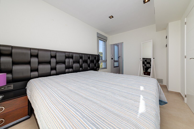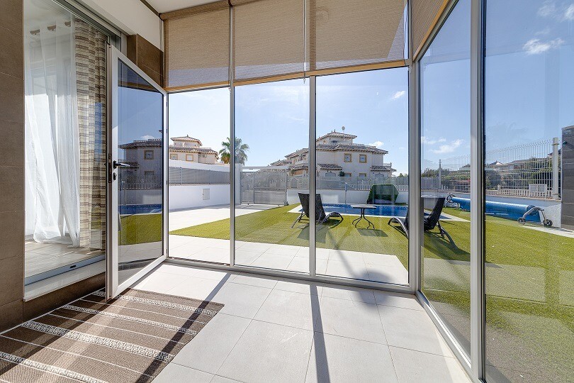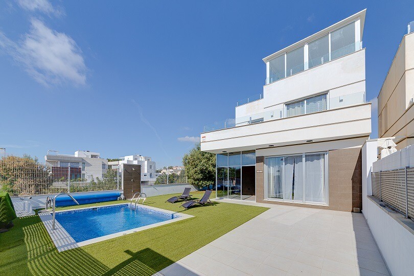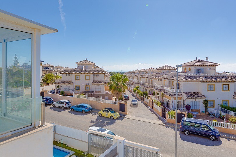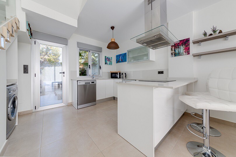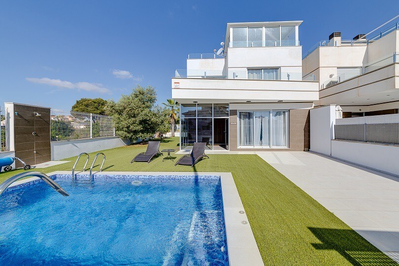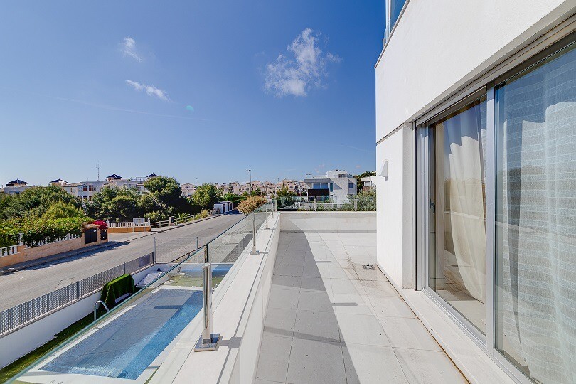 Spectaculaire vrijstaande villa met privézwembad en barbecue gelegen in het Lomas de Cabo Roig-gebied, dicht bij alle voorzieningen, het strand en de golfbanen. Modern design, met hoogwaardige kwaliteiten, recent gebouwd en in perfecte staat. Het heeft twee verdiepingen en ook een solarium met een glazen gedeelte en uitzicht op zee. Het wordt volle...dig gemeubileerd opgeleverd, met warm-koud airconditioning en vloerverwarming in de badkamers. Winkelcentrum La Zenia Boulevard: 1,5 meter Restaurants, cafés, banken, supermarkt: 500 meter Stranden: 2,5 km Afstand tot de luchthaven van Alicante: 50 km Afstand golfbanen: 1,5 km