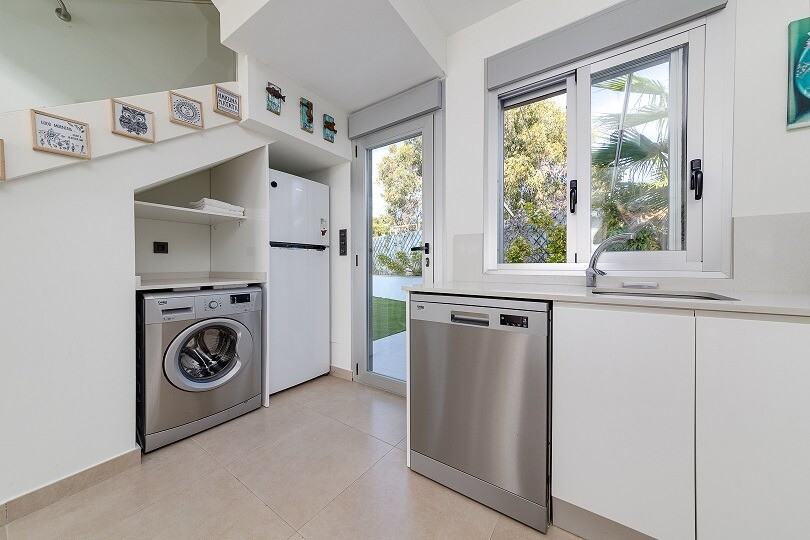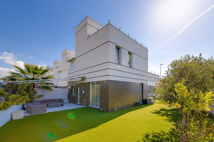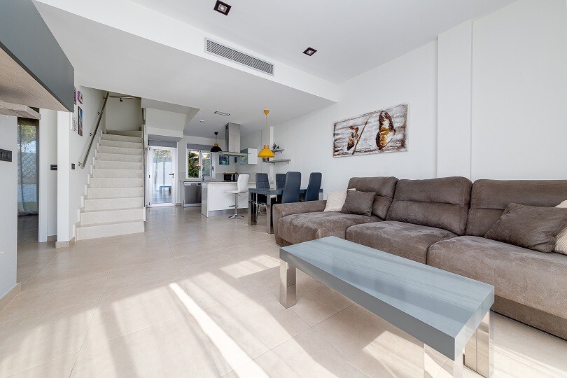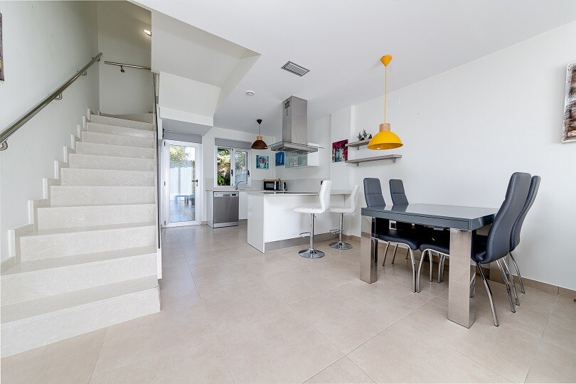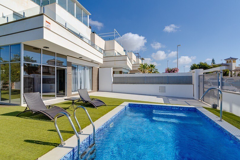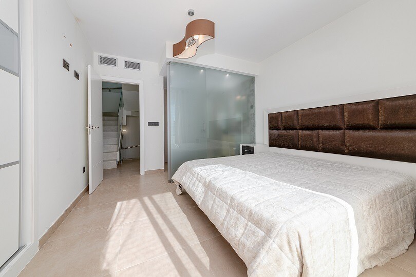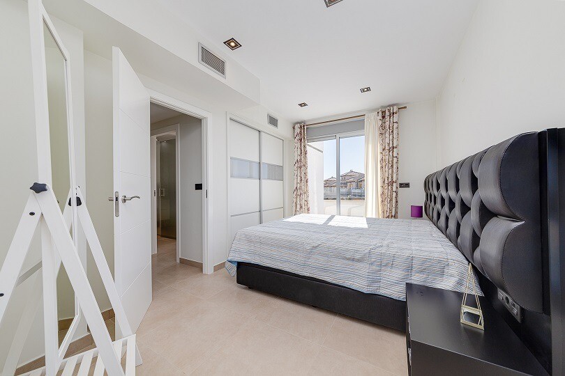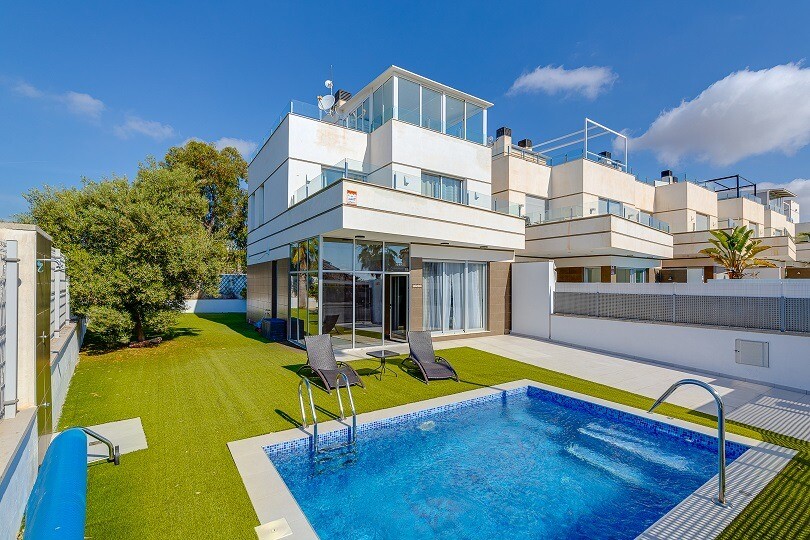 Spectaculaire vrijstaande villa met privézwembad en barbecue gelegen in het Lomas de Cabo Roig-gebied, dicht bij alle voorzieningen, het strand en de golfbanen. Modern design, met hoogwaardige kwaliteiten, recent gebouwd en in perfecte staat. Het heeft twee verdiepingen en ook een solarium met een glazen gedeelte en uitzicht op zee. Het wordt volle...dig gemeubileerd opgeleverd, met warm-koud airconditioning en vloerverwarming in de badkamers. Winkelcentrum La Zenia Boulevard: 1,5 meter Restaurants, cafés, banken, supermarkt: 500 meter Stranden: 2,5 km Afstand tot de luchthaven van Alicante: 50 km Afstand golfbanen: 1,5 km