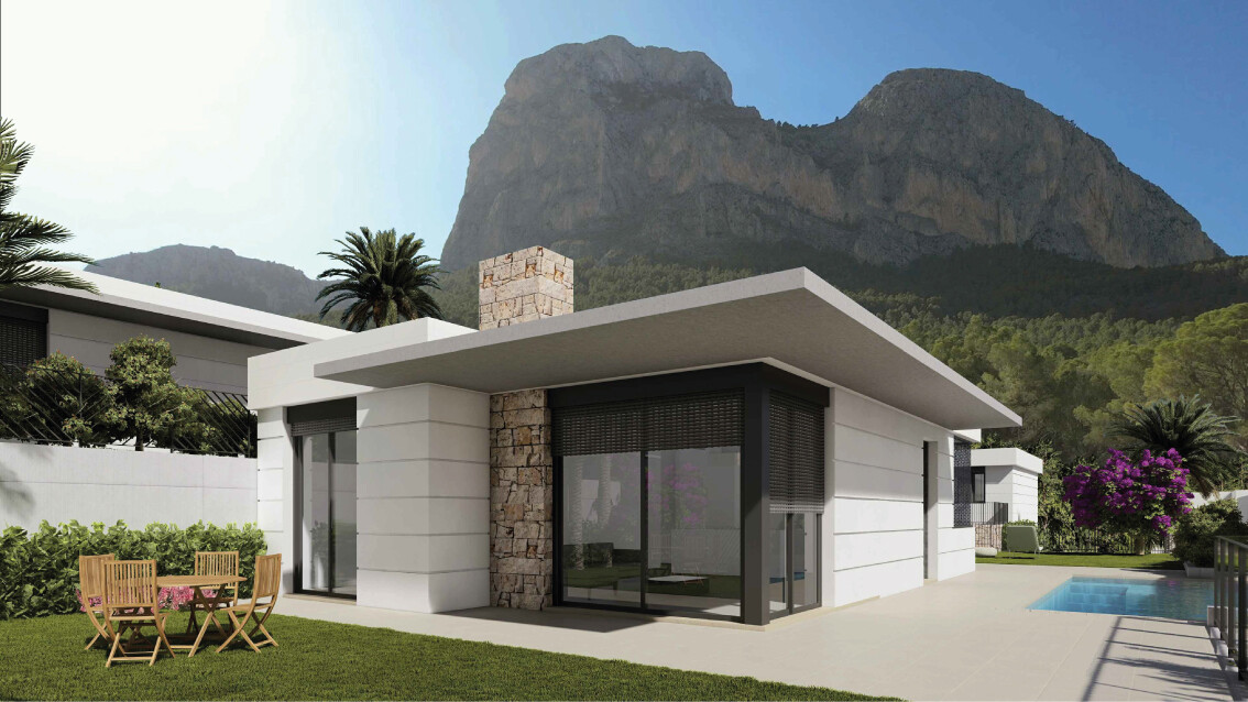 Deze exclusieve nieuwbouw vrijstaande villa, volledig gelijkvloers, biedt 124 m² bebouwde oppervlakte op een perceel van 347 m² in een rustige woonwijk van Polop.