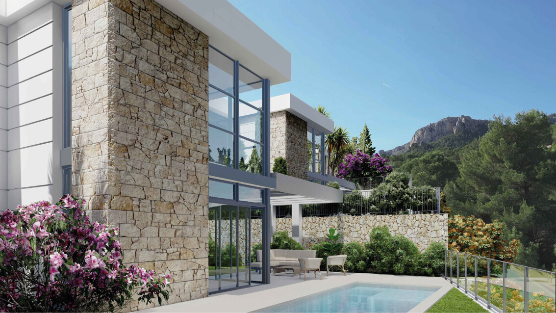 Deze moderne nieuwbouw vrijstaande villa is verdeeld over twee verdiepingen en biedt 157 m² bebouwde oppervlakte op een perceel van 321 m² in een rustige woonwijk van Polop.