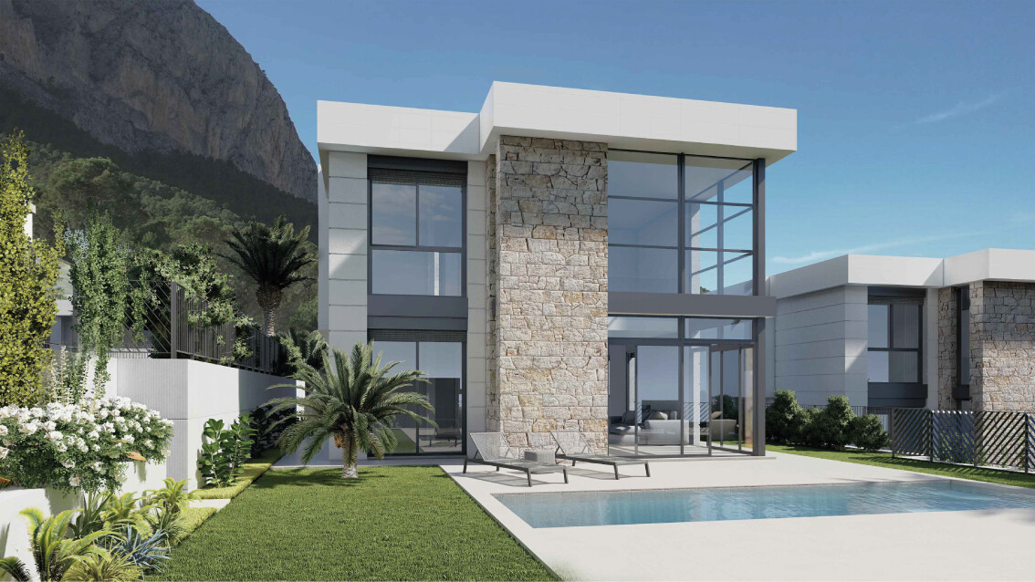 Deze elegante hedendaagse nieuwbouwvilla is verdeeld over twee verdiepingen en biedt 163 m² bebouwde oppervlakte op een perceel van 393 m² in een rustige woonwijk van Polop.