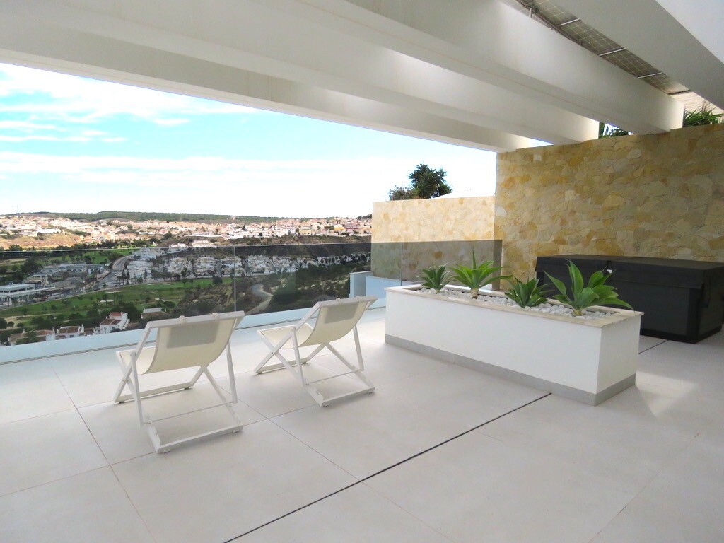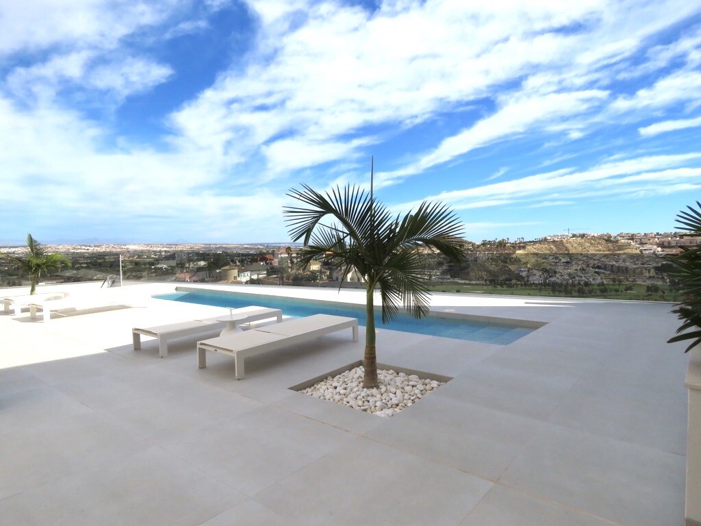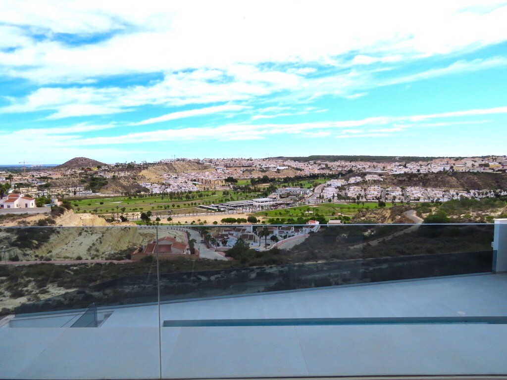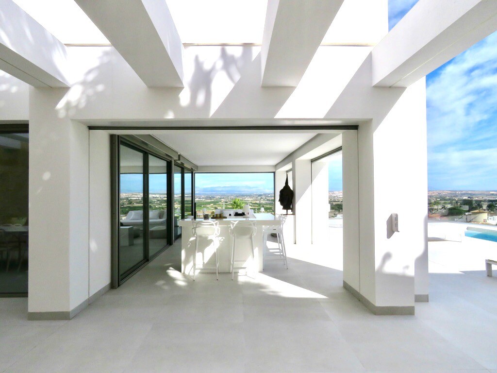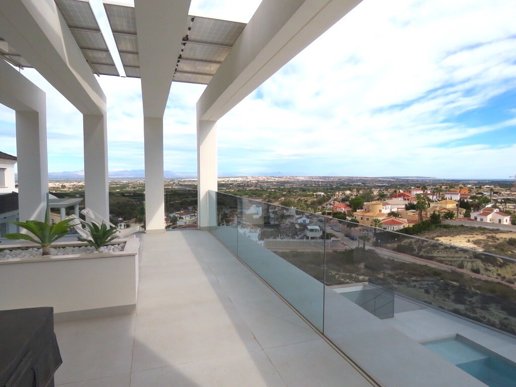 Solarium van 66m2. Deze design villa is uitgerust met de nieuwste technologie en alle materialen zijn zorgvuldig gekozen. Op de begane grond bevindt zich de woon- en eetkamer met keuken, bijkeuken en ook het overdekte terras. Op de eerste verdieping hebben we 3 slaapkamers en 3 badkamers. Op garageniveau bevindt zich uiteraard de garage met ruimte ...voor 8 auto's, een entertainmentruimte en de 4de slaapkamer en badkamer. Alle verdiepingen van het huis zijn voorzien van vloerverwarming en het huis is ook volledig voorzien van airconditioning. De lift brengt u vanuit de garage naar de bovenste verdieping van de woning. Deze prachtige villa is tevens voorzien van zonnepanelen. Deze villa heeft een zwembad 12x2m, een buiten douche met wc en lavabo. Het commercieel centrum met clubhuis van La Marquesa Golf ligt op slechts 900m van deze villa. De luchthaven van Alicante is bereikbaar in 30 minuten.