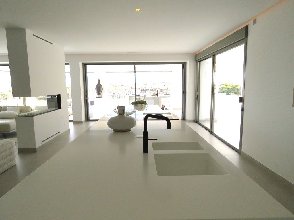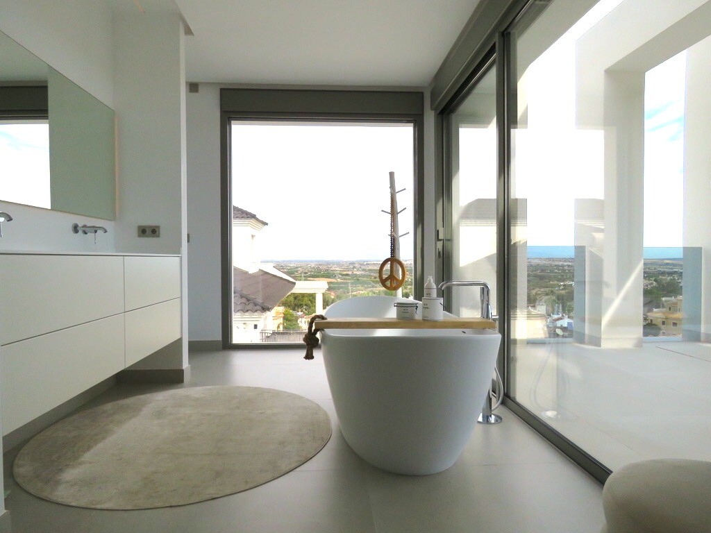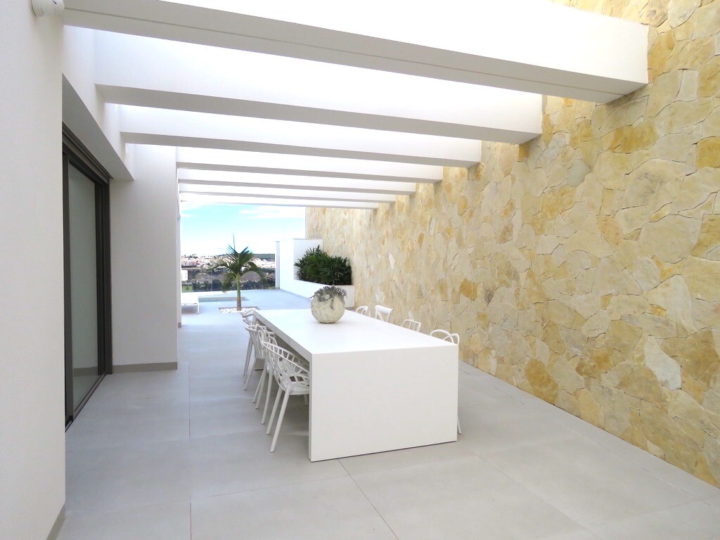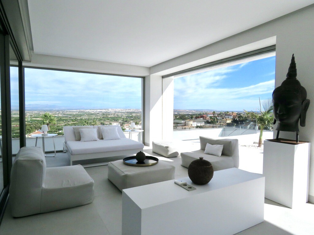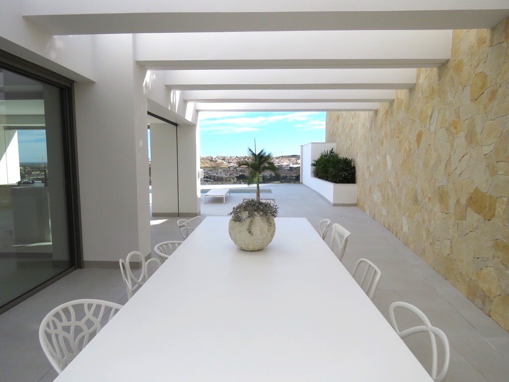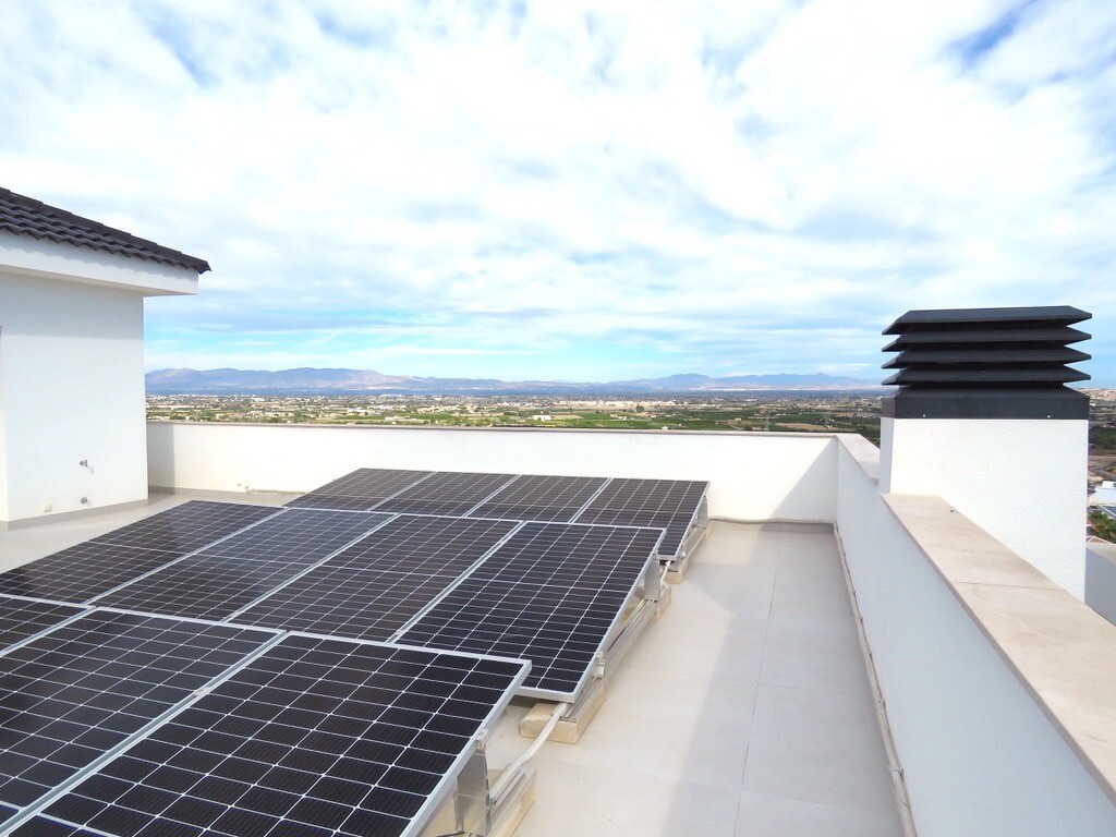 Solarium van 66m2. Deze design villa is uitgerust met de nieuwste technologie en alle materialen zijn zorgvuldig gekozen. Op de begane grond bevindt zich de woon- en eetkamer met keuken, bijkeuken en ook het overdekte terras. Op de eerste verdieping hebben we 3 slaapkamers en 3 badkamers. Op garageniveau bevindt zich uiteraard de garage met ruimte ...voor 8 auto's, een entertainmentruimte en de 4de slaapkamer en badkamer. Alle verdiepingen van het huis zijn voorzien van vloerverwarming en het huis is ook volledig voorzien van airconditioning. De lift brengt u vanuit de garage naar de bovenste verdieping van de woning. Deze prachtige villa is tevens voorzien van zonnepanelen. Deze villa heeft een zwembad 12x2m, een buiten douche met wc en lavabo. Het commercieel centrum met clubhuis van La Marquesa Golf ligt op slechts 900m van deze villa. De luchthaven van Alicante is bereikbaar in 30 minuten.