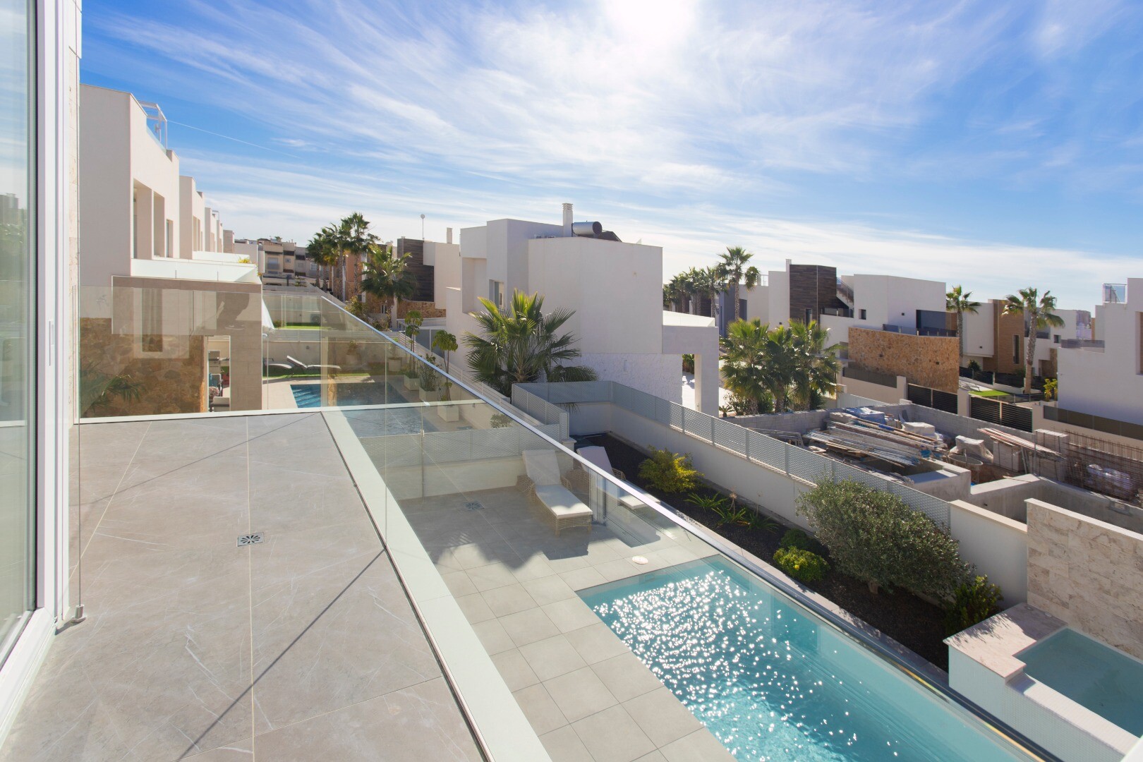 2 villa's gelegen in de wijk Aguas Nuevas (Torrevieja) 150 vierkante meter verdeeld over 3 slaapkamers, 2 badkamers en een grote woonkamer / keuken. De percelen zijn 300 vierkante meter. Open zicht naar het zwembad met ingebouwde jacuzzi en waterval vanuit de woonkamer. Een groot solarium met barbecue op het dakterras.